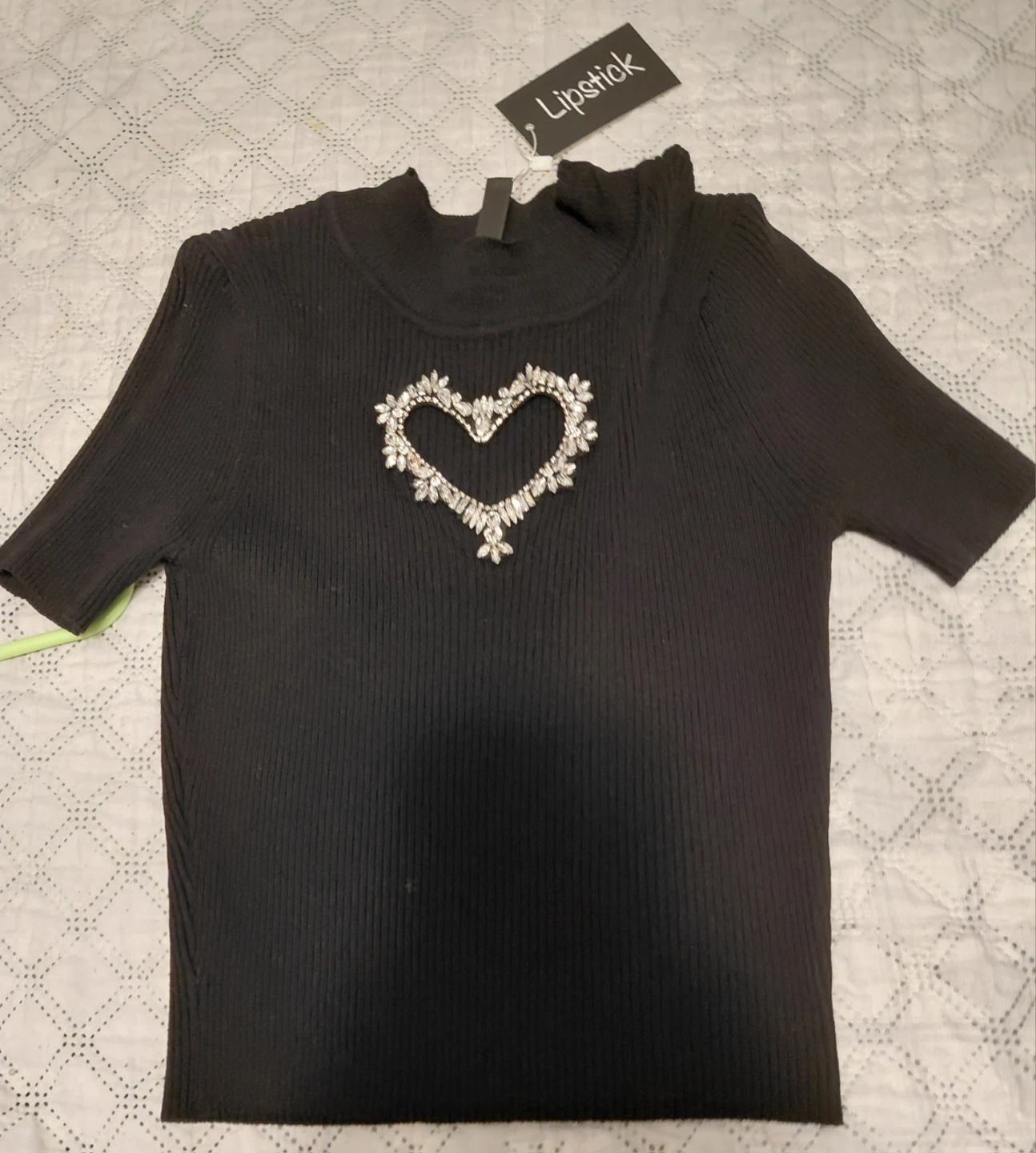 Lipstick Black Ribbed Knit Heart Rhinestone Top