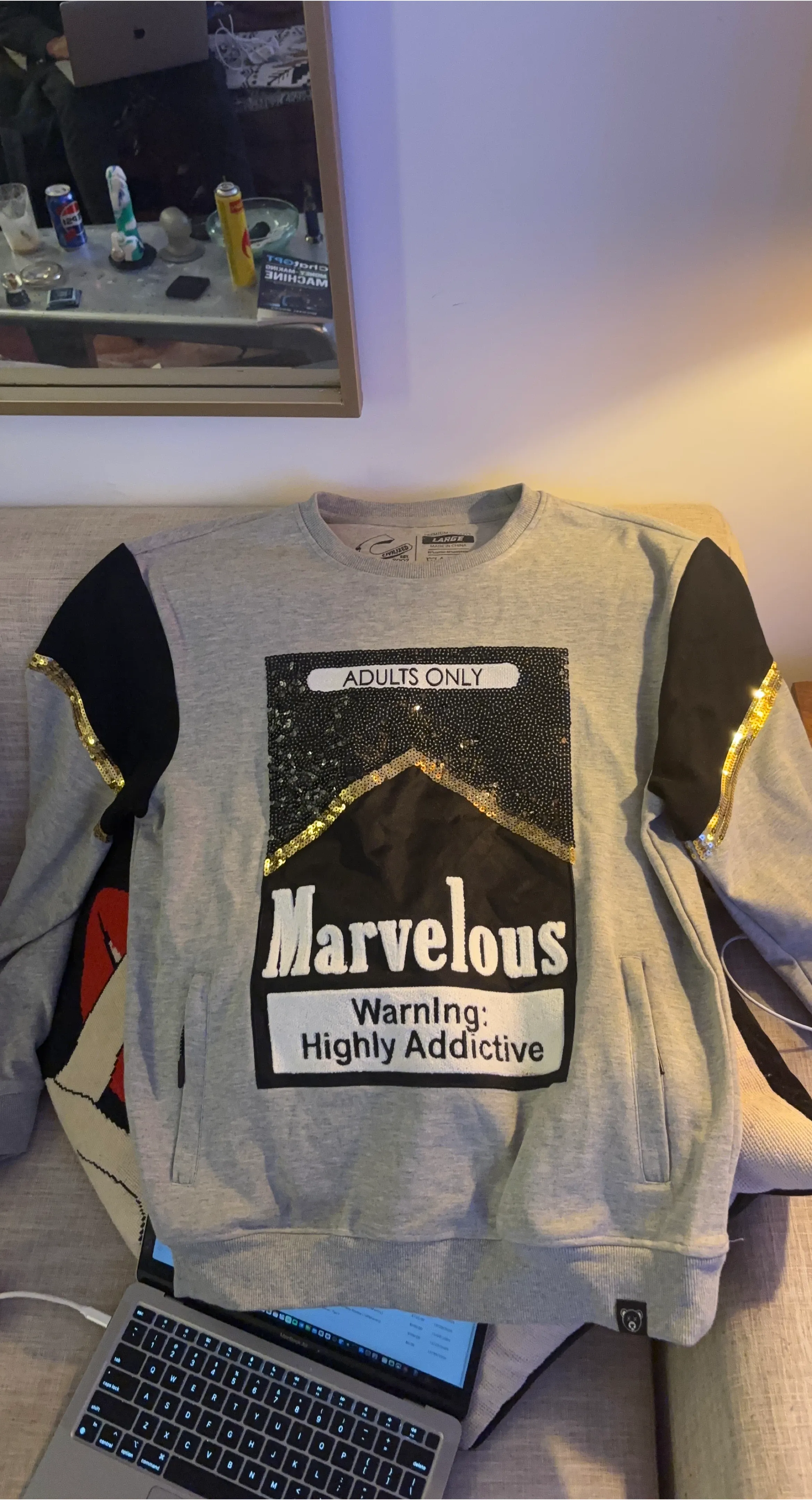 Selling a Civilized brand sweatshirt in size Large. It features a unique 'Marvelous' design with an 'Adults Only' detail. The sweatshirt is grey with black and gold accents on the sleeves.