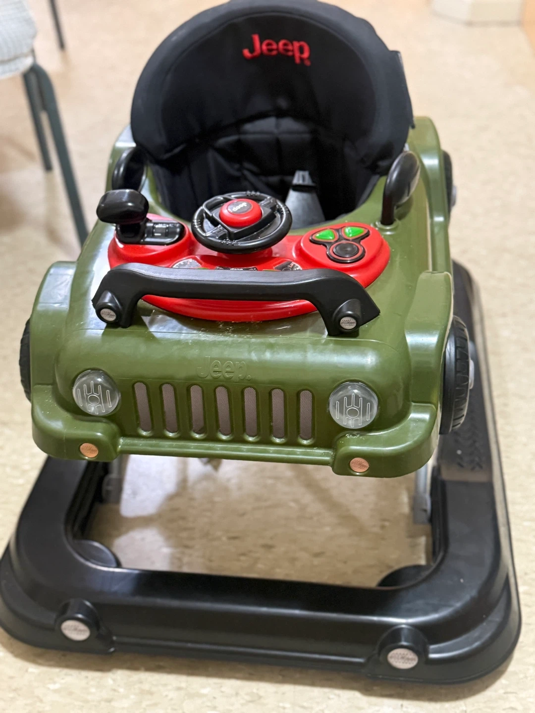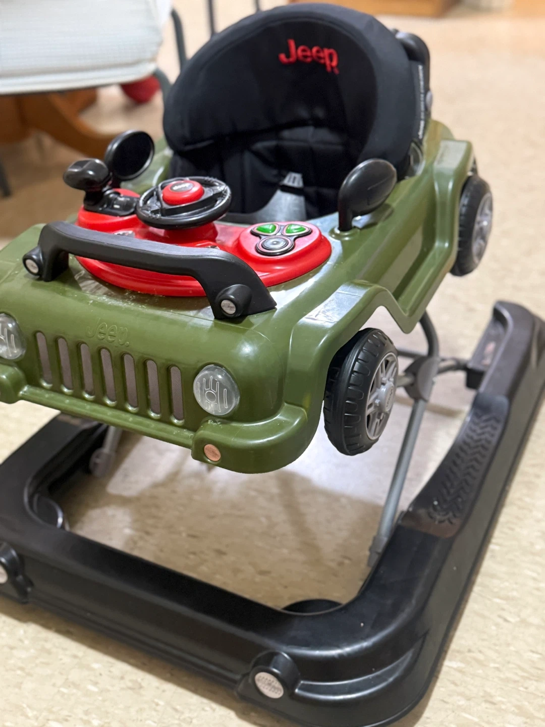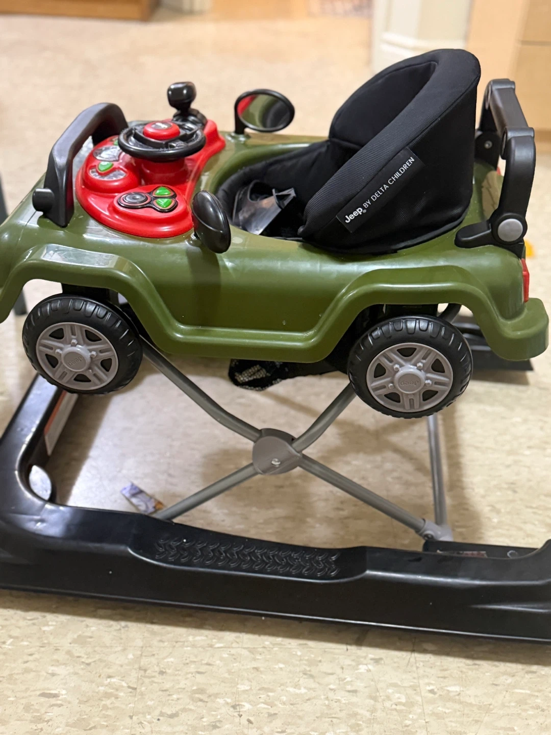 This Jeep-themed baby walker by Delta Children is designed to look like a classic Jeep Wrangler. It features a red steering wheel and button details. The seat is black with "Jeep by Delta Children" printed on it. A great way for little ones to explore their surroundings! One wheel is missing you can get it on Amazon