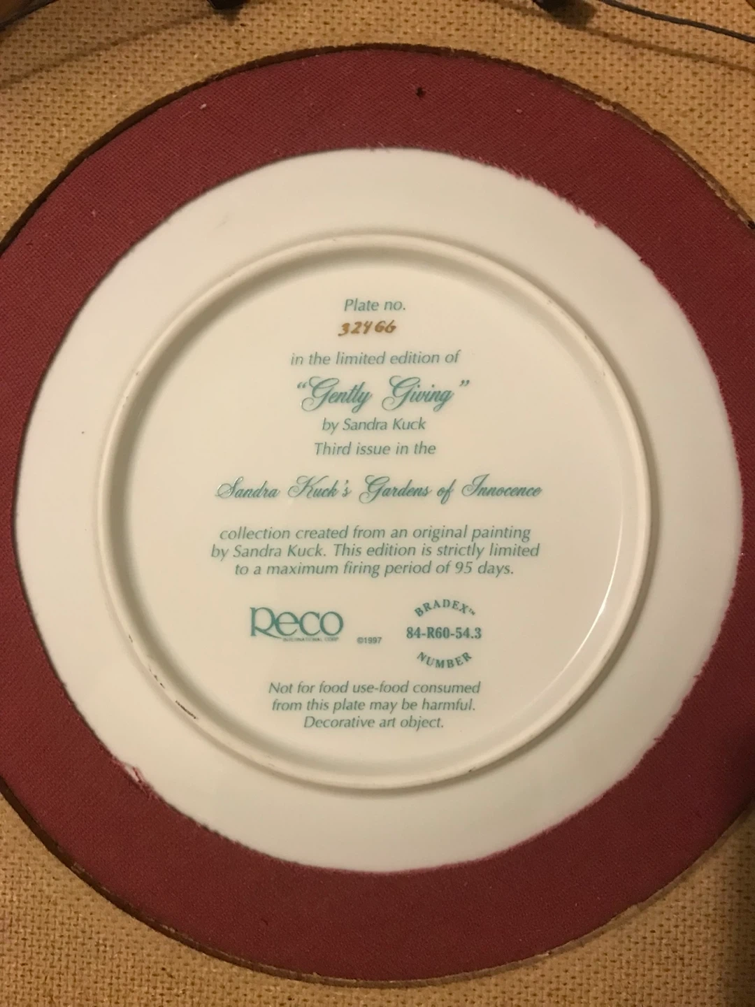 Two limited edition decorative plates by Sandra Kuck, "Gently Giving" and "Moments of Reflection". Both are collectible art objects with wooden frames. They were produced by Peco, with "Gently Giving" being the third issue in Sandra Kuck's Gardens of Innocence collection, and "Moments of Reflection" the sixth issue in Moments at Home. These plates are for decorative use only.