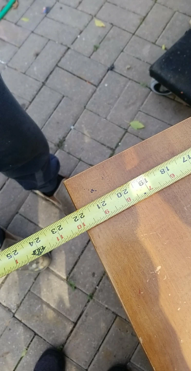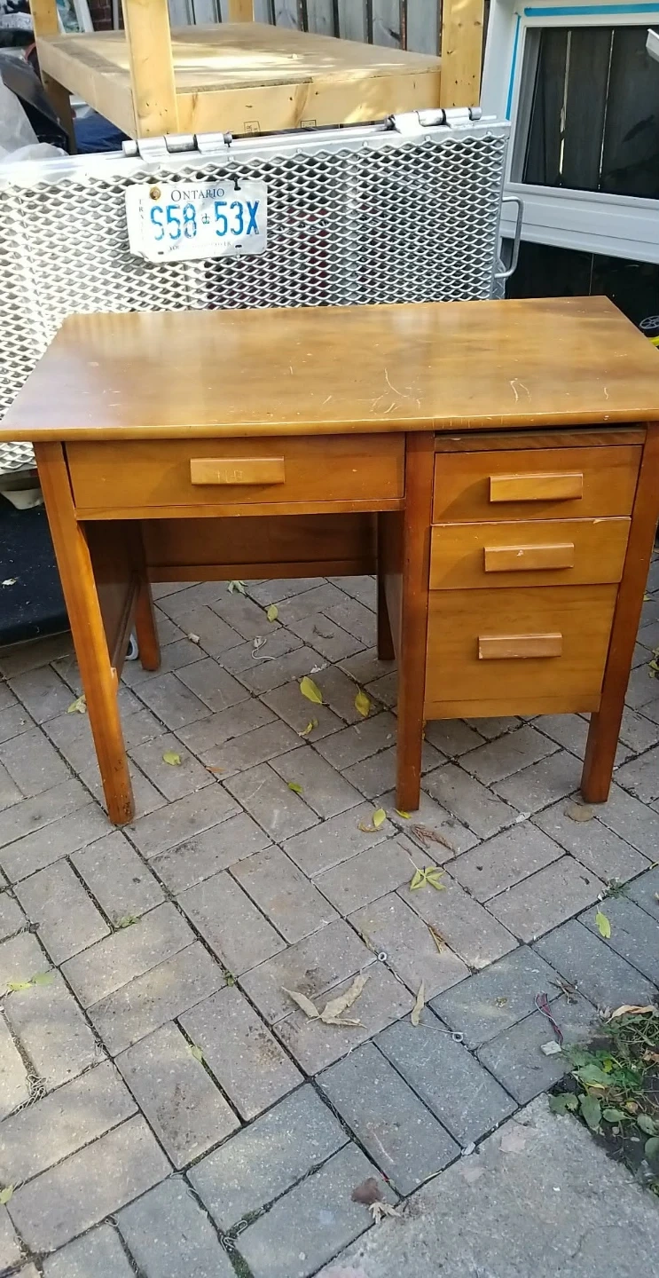 Selling a wooden desk. It measures approximately 38 inches in length and 24 inches in width. It has a drawer and three smaller drawers on the right side. Good condition.