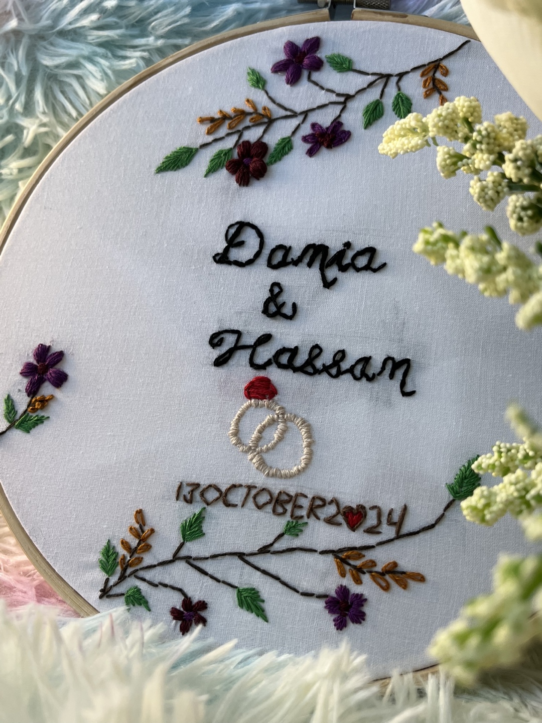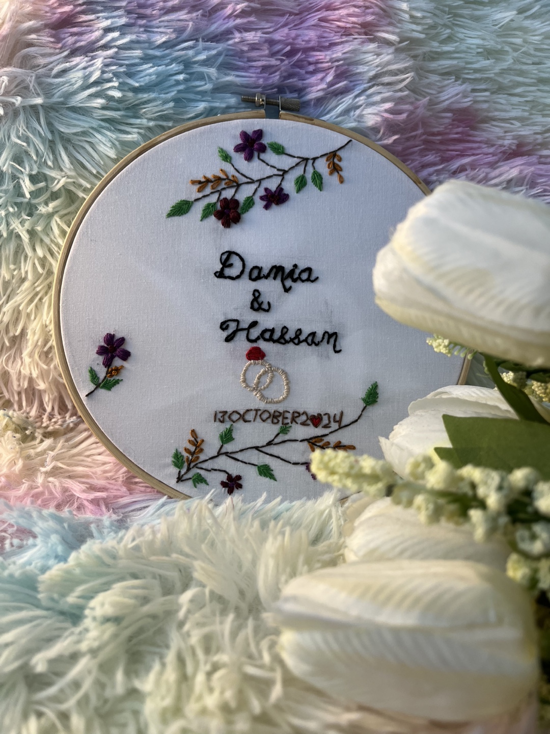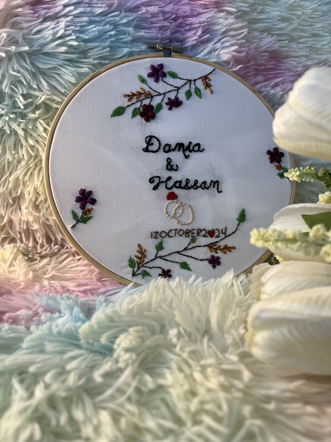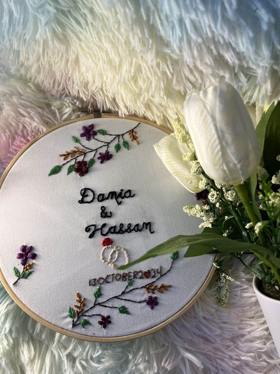 Looking for a heartfelt, handmade gift? This beautifully embroidered hoop features a personalized couple’s name, floral designs, wedding rings, and a special date – perfect for weddings, anniversaries, or engagement gifts!