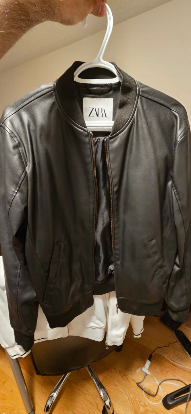 Black faux leather bomber jacket from Zara. It's a size small with a full zip closure. This jacket is lightweight and stylish! It's in perfect condition, barely worn.