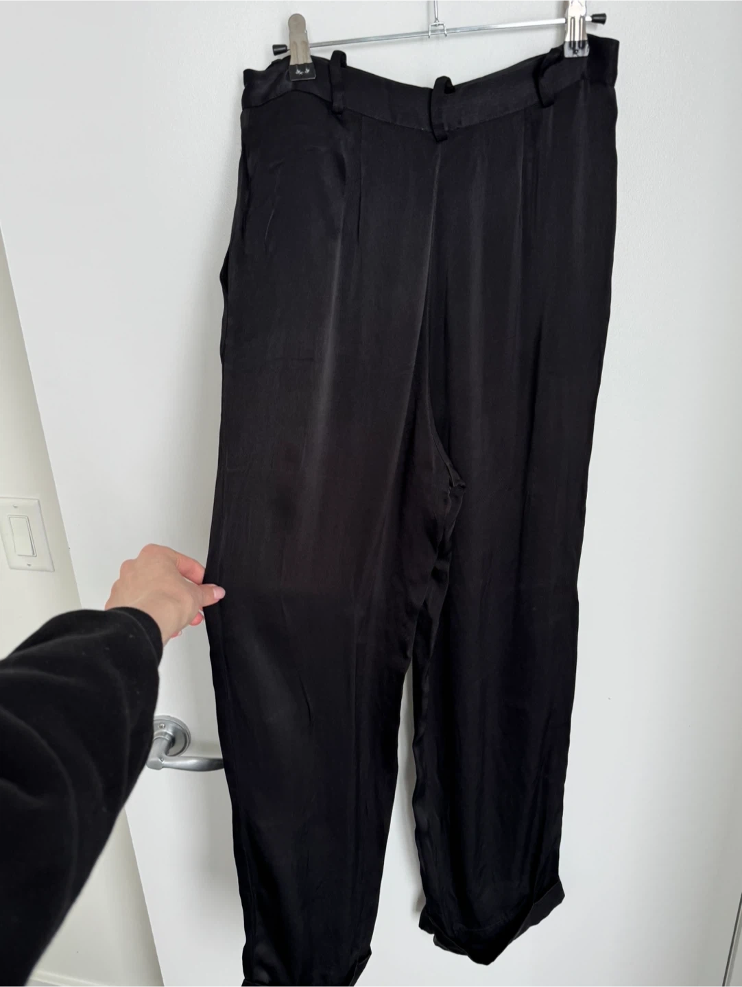 These chic black satin wide leg pants are a versatile addition to any wardrobe. They feature a smooth, shiny finish and a comfortable, flowing fit. Perfect for dressing up or down!
