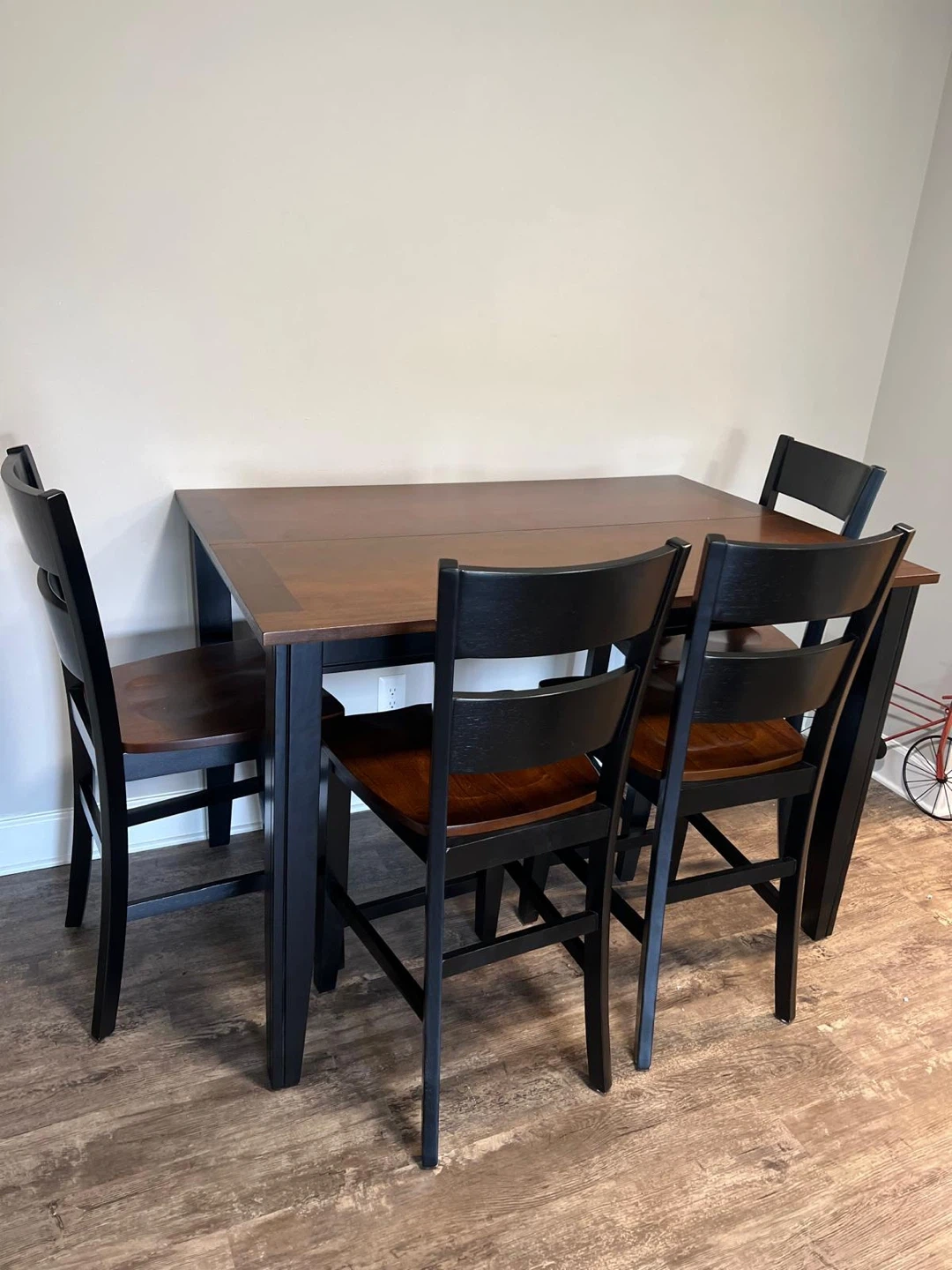 This counter height dining set includes a rectangular table and four matching chairs. The table features a warm brown wood top with a black base and legs. The chairs have black frames and seats. It's a great option for a kitchen nook or smaller dining area!
