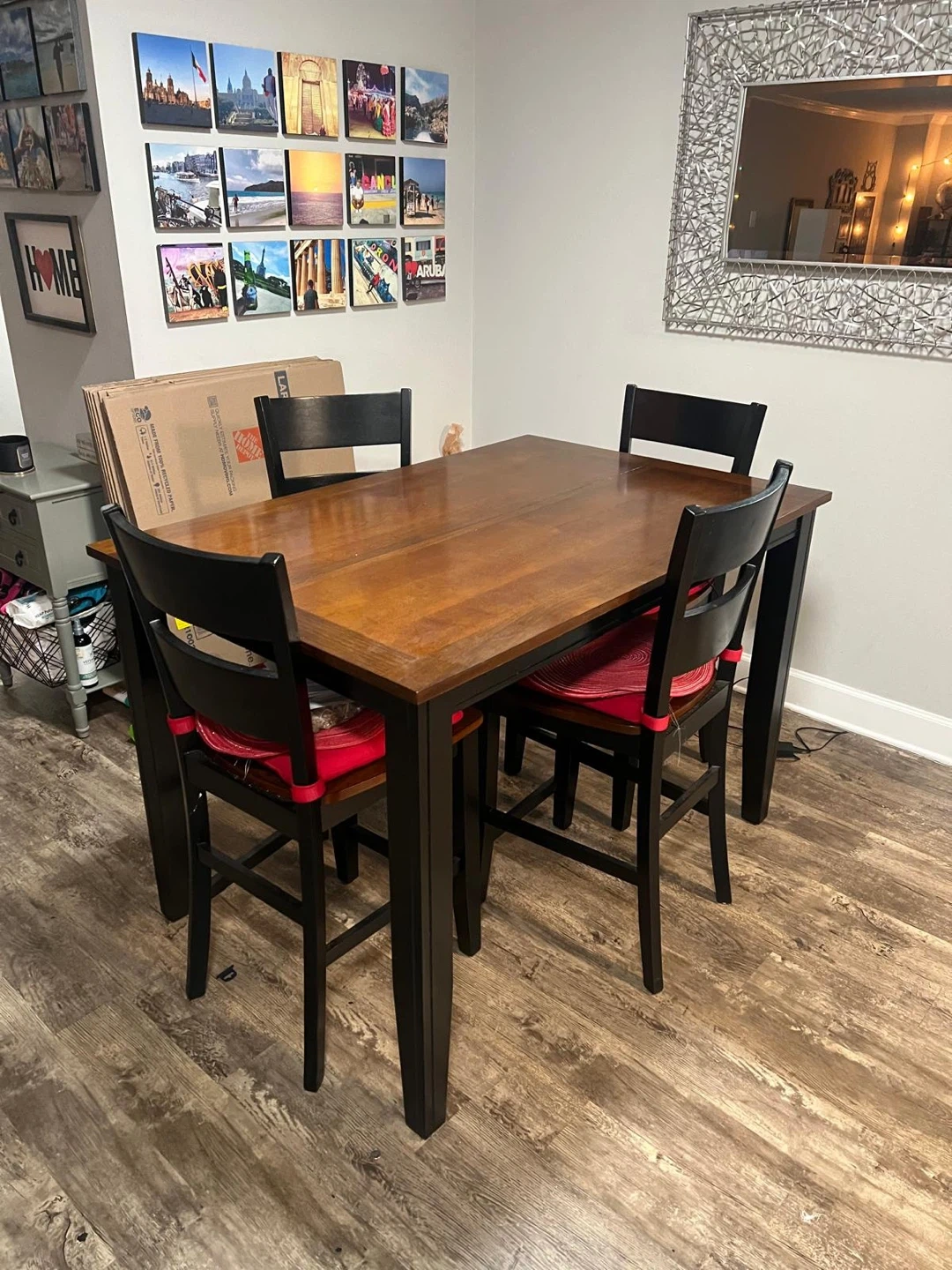 This counter height dining set includes a rectangular table and four matching chairs. The table features a warm brown wood top with a black base and legs. The chairs have black frames and seats. It's a great option for a kitchen nook or smaller dining area!