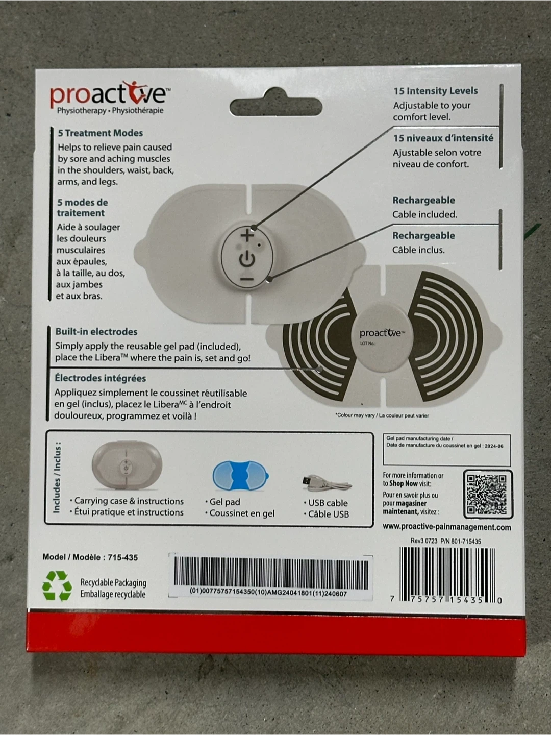 This Proactive Libera wire-free TENS device relieves pain without drugs. It has 5 treatment modes and 15 intensity levels. The device is rechargeable and includes a USB cable, gel pad, and a carrying case with instructions.