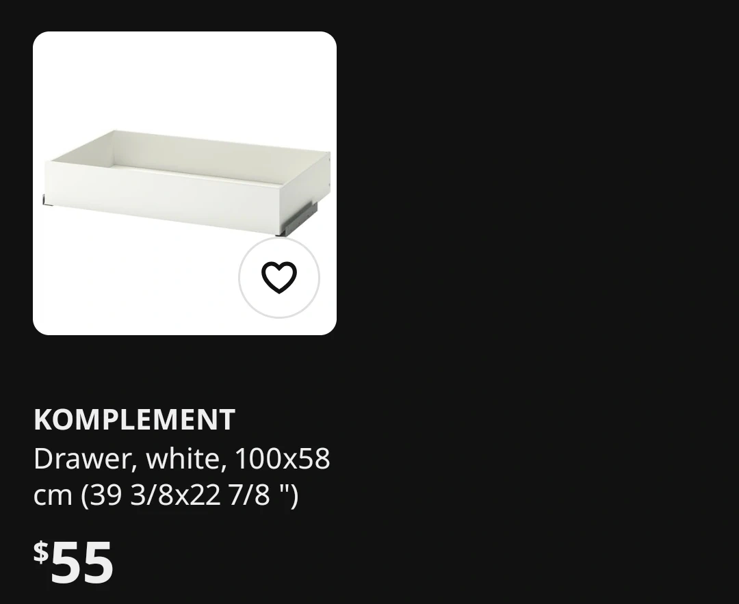 I'm selling a brand new IKEA KOMPLEMENT drawer in white, still in its original packaging! The size is 100x58 cm (39 3/8x22 7/8 "). I bought this for $55 plus taxes. Qty 2 selling for 40 each