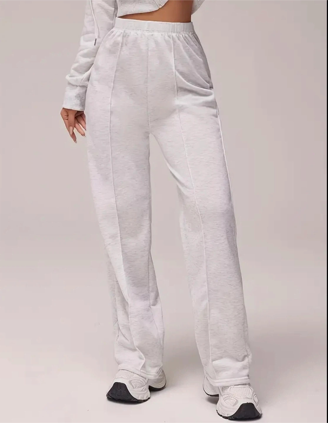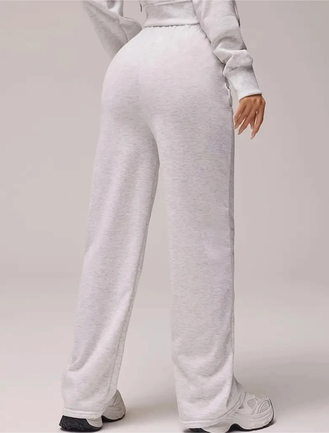New, unworn Comfy wide-leg sweatpants in a light grey marled fabric. Size L. Features an elastic adhesive waistband for a perfect fit. These pants offer a relaxed silhouette and are made from a soft, breathable material.