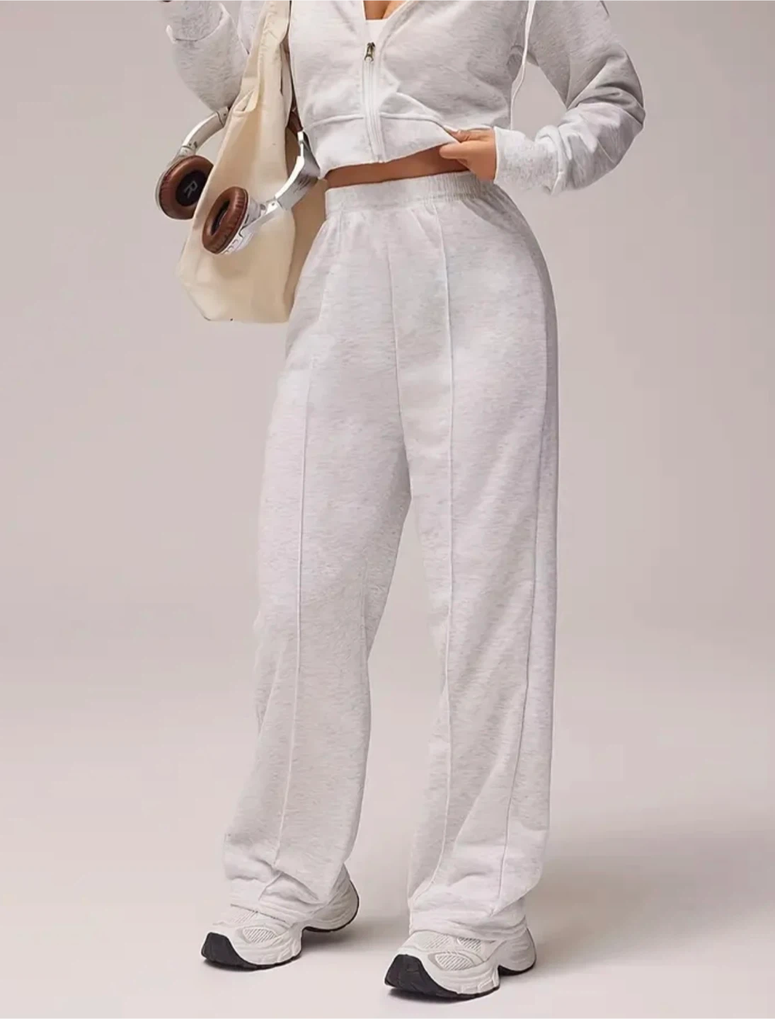 New, unworn Comfy wide-leg sweatpants in a light grey marled fabric. Size L. Features an elastic adhesive waistband for a perfect fit. These pants offer a relaxed silhouette and are made from a soft, breathable material.