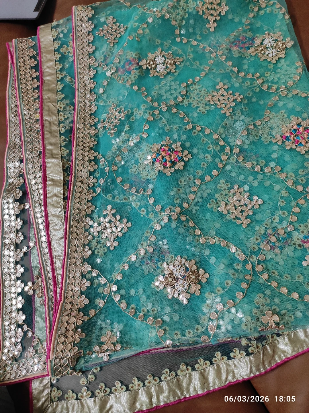 Beautiful teal net fabric with intricate gold thread embroidery and colourful beaded accents.