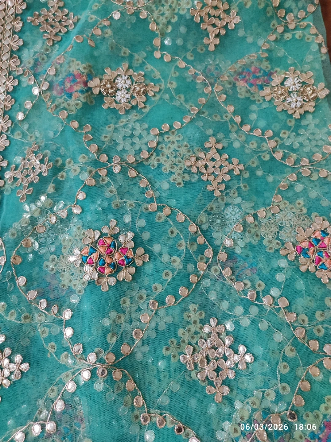 Beautiful teal net fabric with intricate gold thread embroidery and colourful beaded accents.
