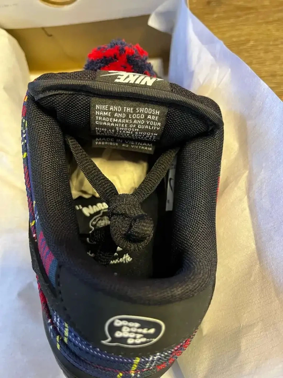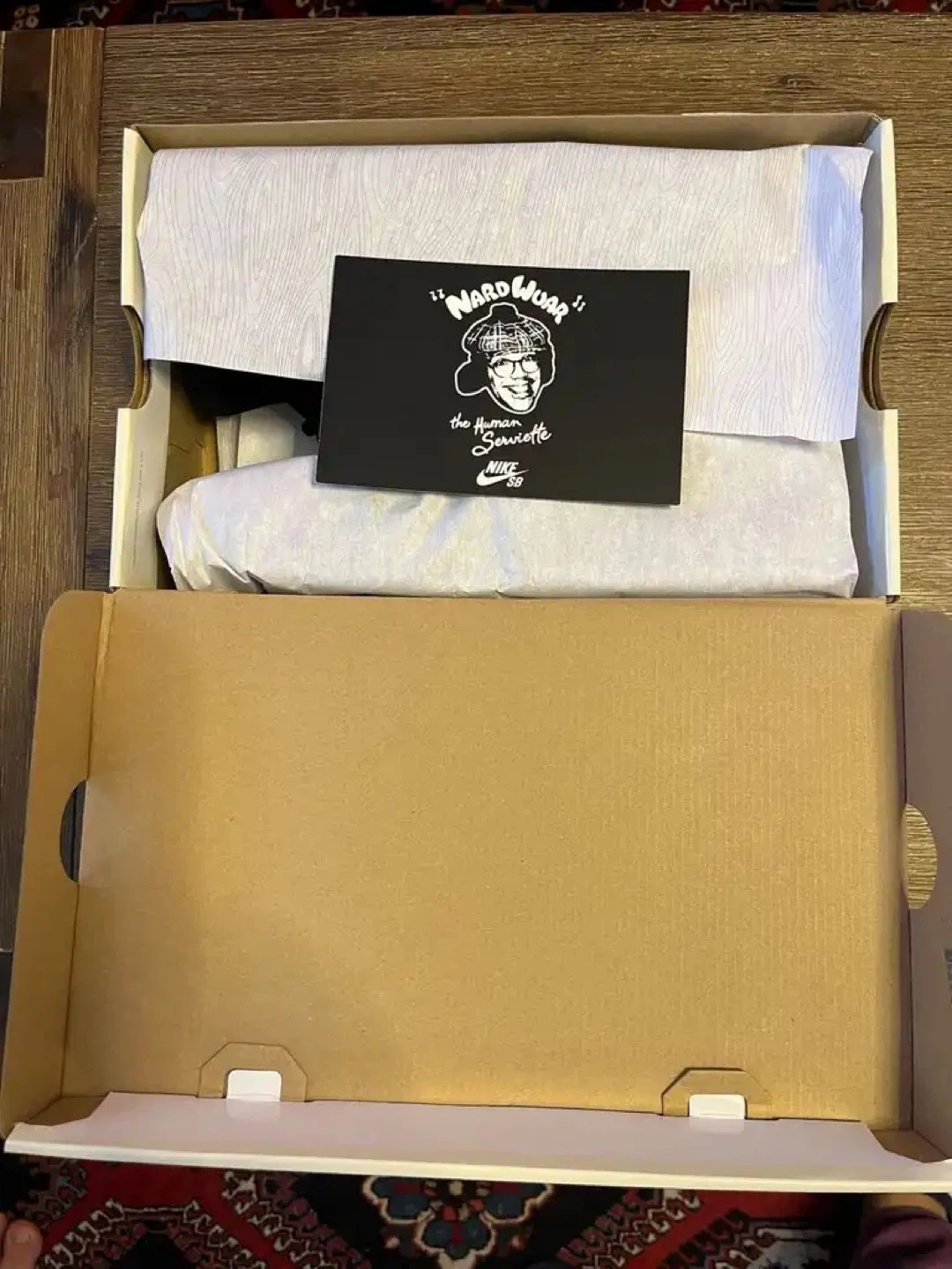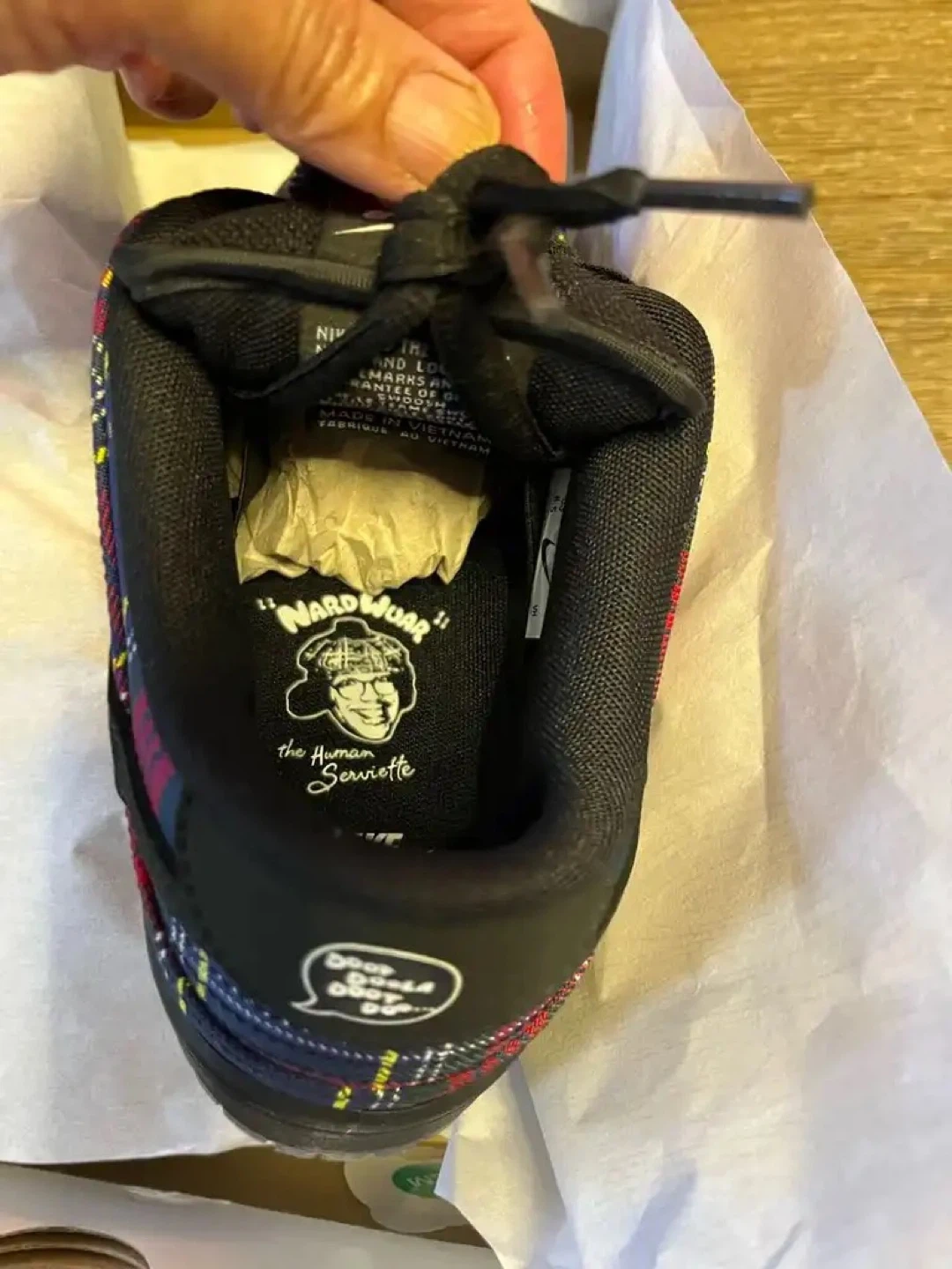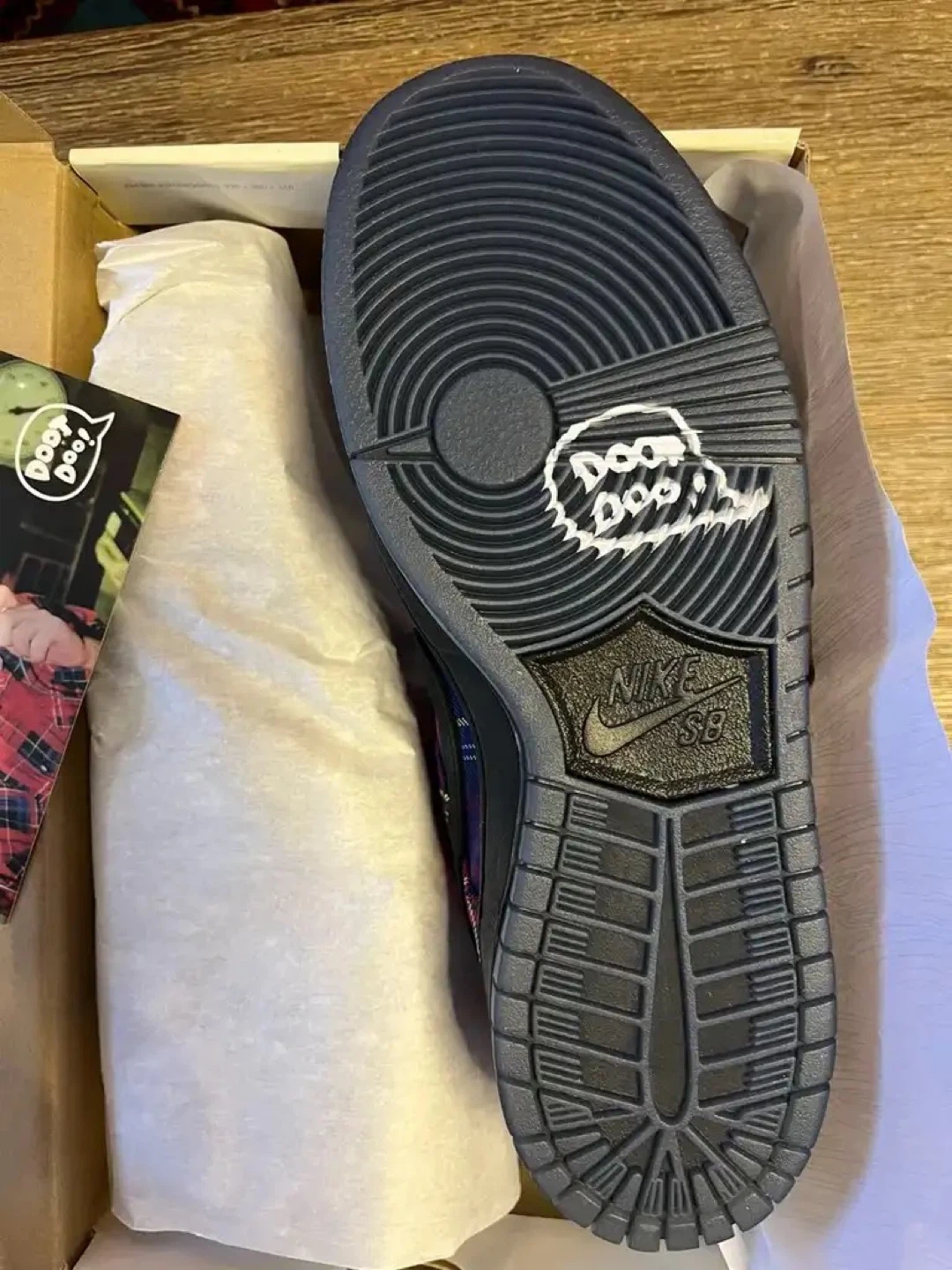 Serious Nike Sb Collectors this is the one up for grabs is an insanely rare pair of Nike Sb Dunk Low “Nardwuar” in Brandnew Condition, complete with original box, packaging, and the exclusive Nardwuar post card insert. One of the most unique and hardest to find Sb collabs of the era and this pair is even more special.