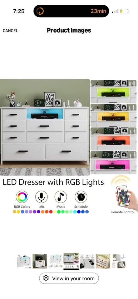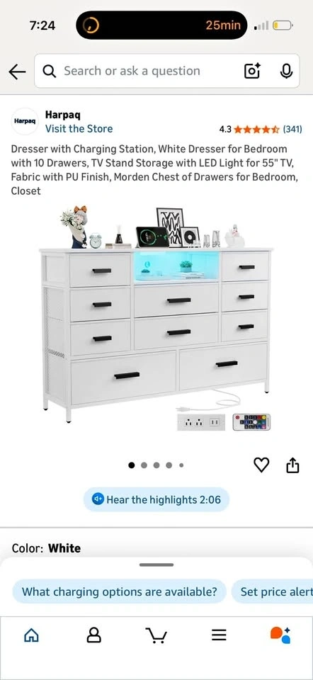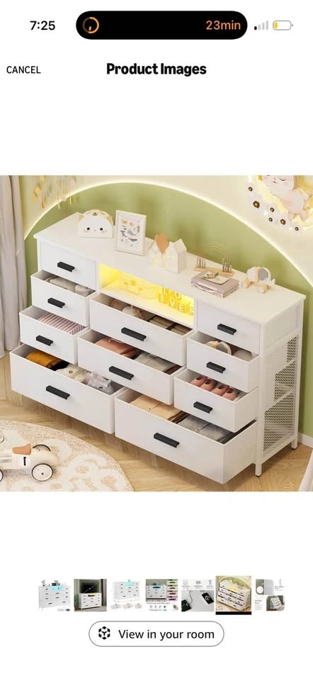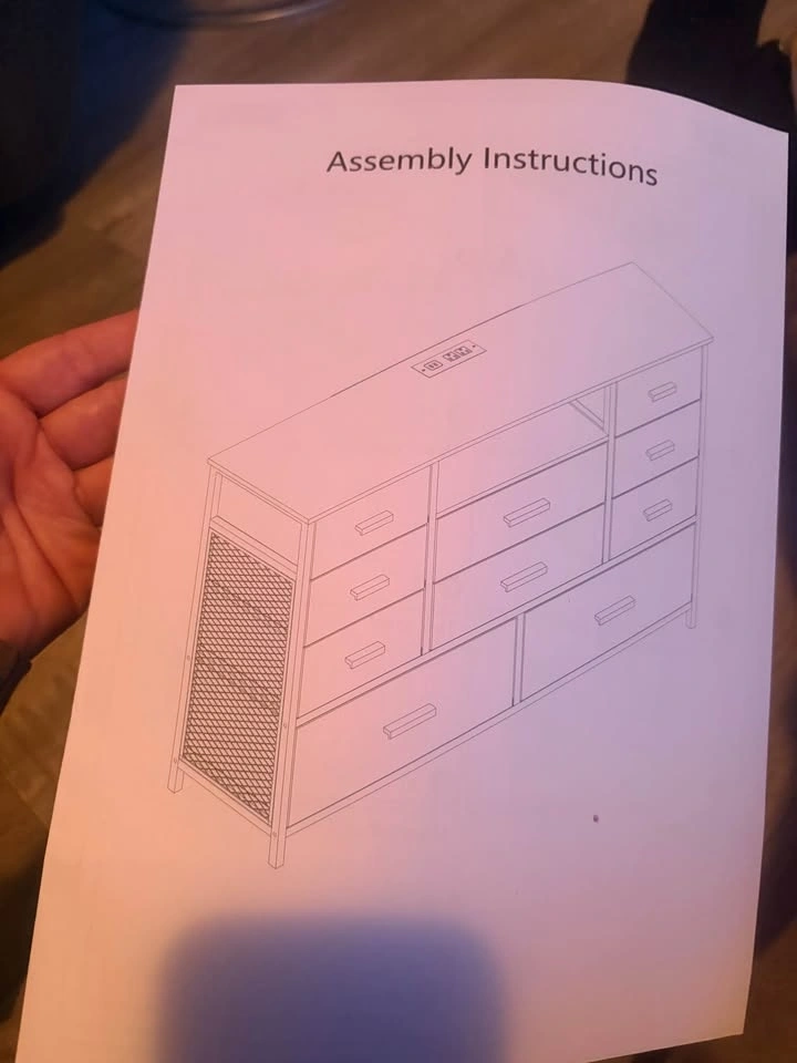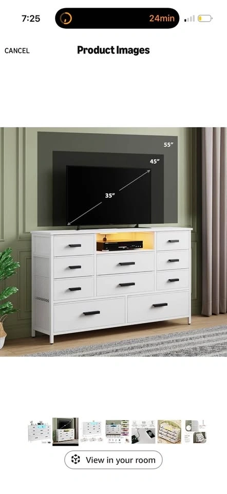Brand new in the box! This dresser combines functionality and style with a built-in power outlet and adjustable LED lights. It features 2 AC outlets and 2 USB ports for charging phones and other devices. The dresser has 10 fabric drawers for ample storage, perfect for organizing clothes, blankets, and more. The top can support up to 111 LBS, and drawers can hold 11-23 LBS depending on size. It can also be used as a TV stand for TVs up to 55 inches. Made with a sturdy steel frame and MDF, it includes adjustable feet for stability and an anti-toppling device for safety. Easy assembly with included instructions.