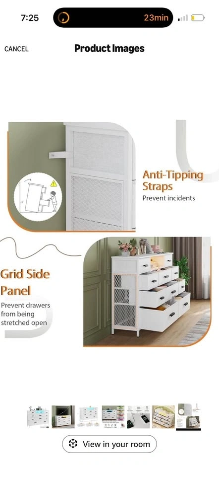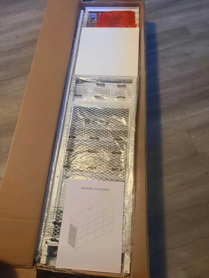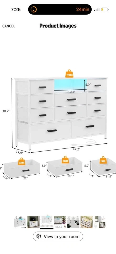 Brand new in the box! This dresser combines functionality and style with a built-in power outlet and adjustable LED lights. It features 2 AC outlets and 2 USB ports for charging phones and other devices. The dresser has 10 fabric drawers for ample storage, perfect for organizing clothes, blankets, and more. The top can support up to 111 LBS, and drawers can hold 11-23 LBS depending on size. It can also be used as a TV stand for TVs up to 55 inches. Made with a sturdy steel frame and MDF, it includes adjustable feet for stability and an anti-toppling device for safety. Easy assembly with included instructions.