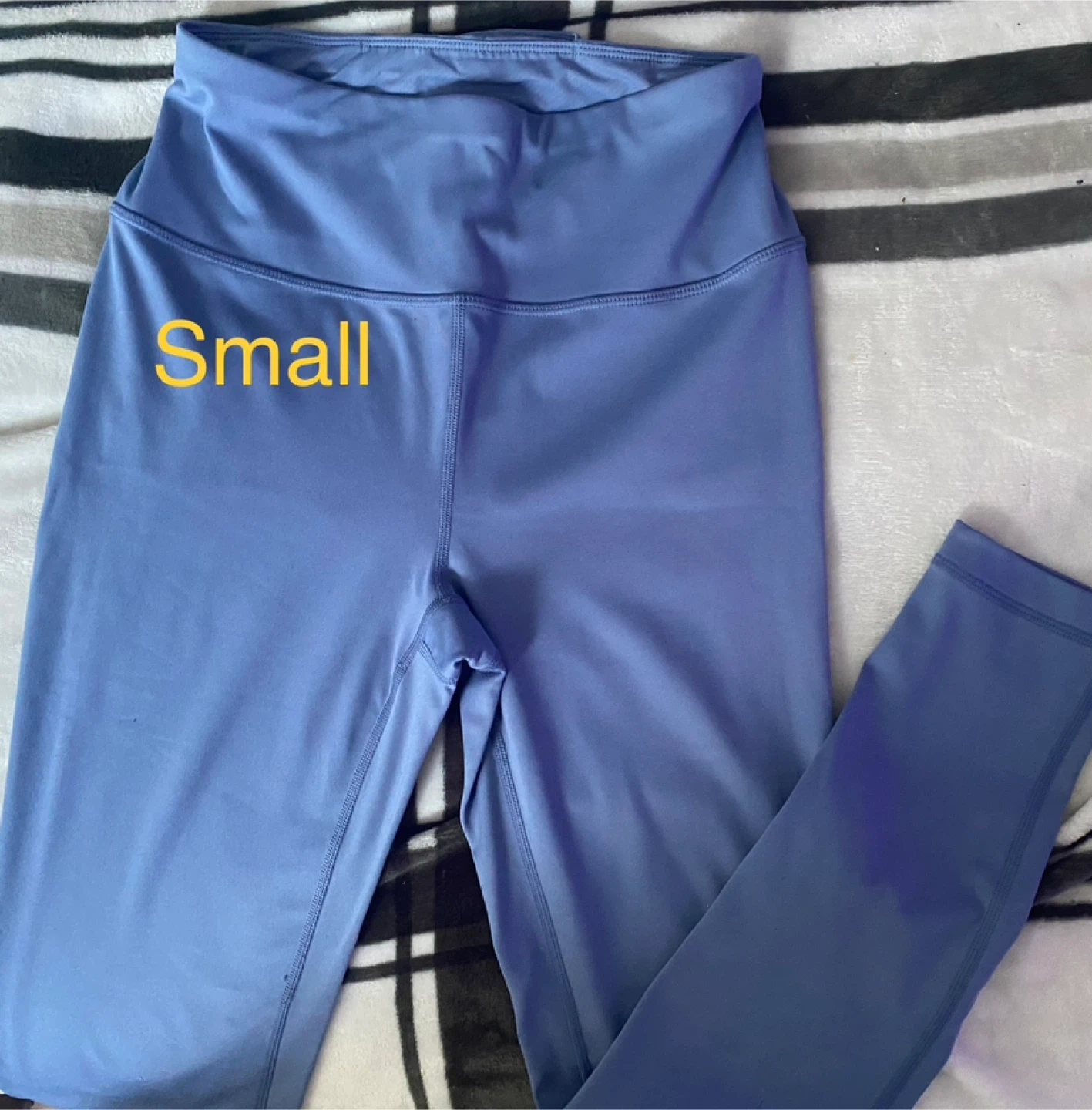 These blue athletic leggings are a size small. They're made from a stretchy material for comfort. They are perfect for your workouts or lounging around the house!