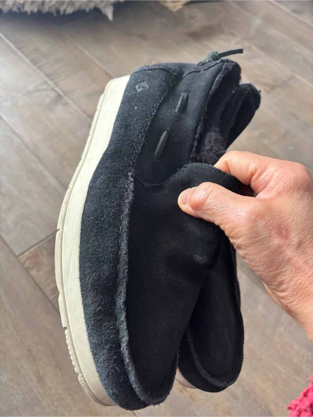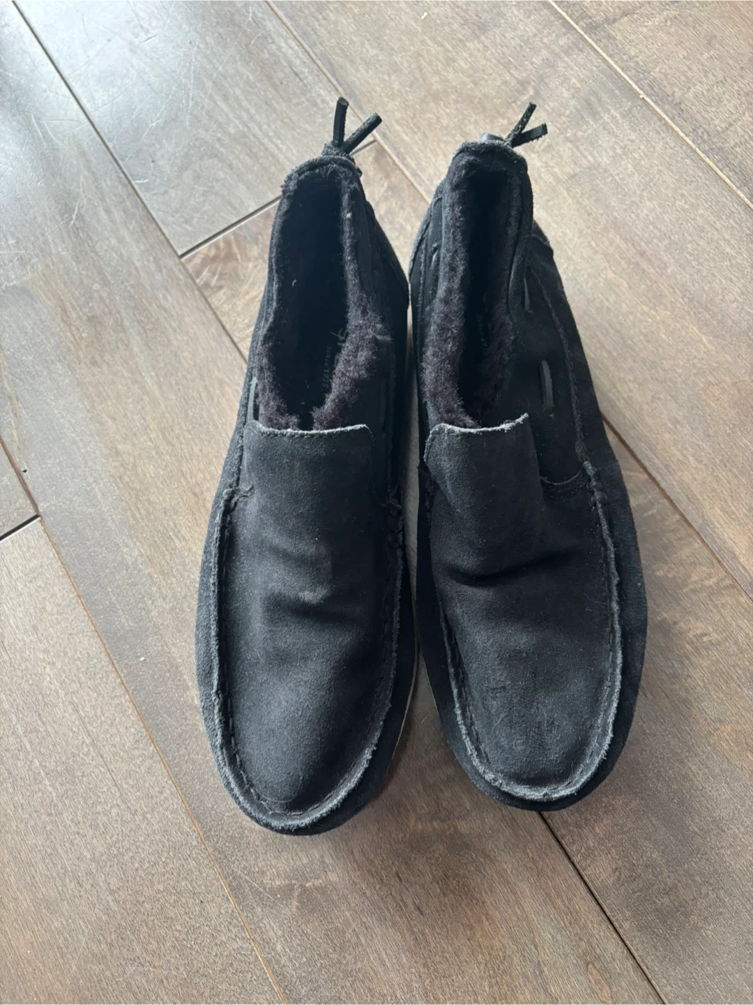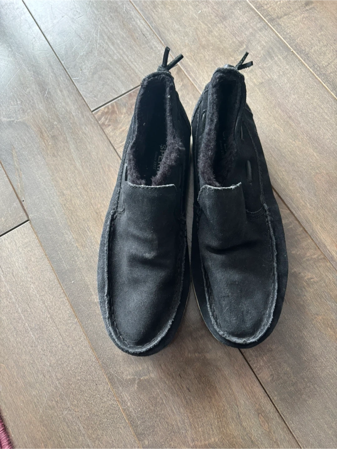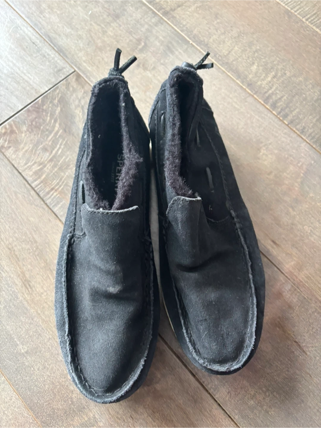 Cozy Sperry moccasins in black suede with a warm fleece lining. These slip-on shoes are perfect for keeping your feet toasty on cooler days. They feature a durable sole with a distinctive grip pattern.🥕