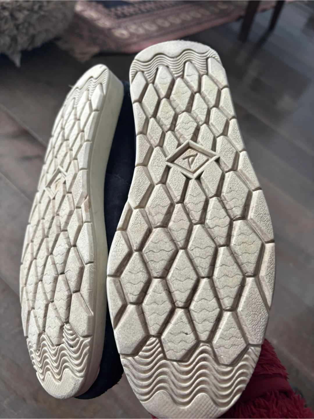 Cozy Sperry moccasins in black suede with a warm fleece lining. These slip-on shoes are perfect for keeping your feet toasty on cooler days. They feature a durable sole with a distinctive grip pattern.🥕