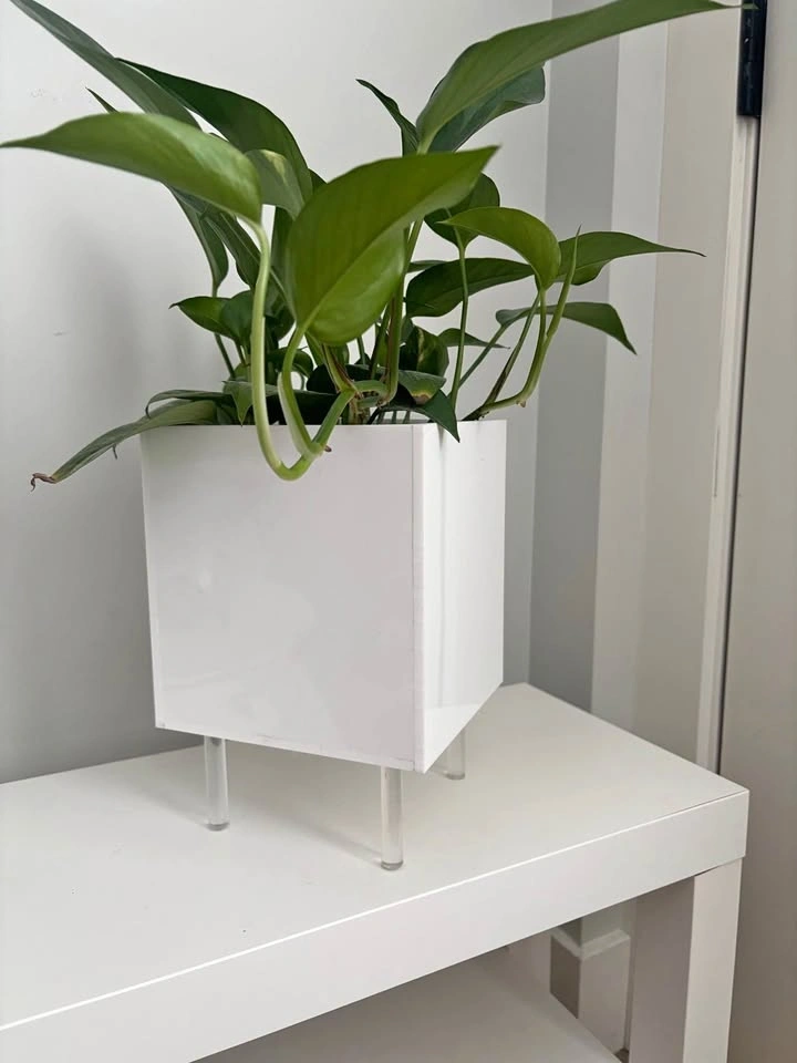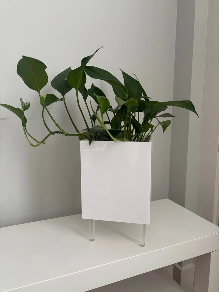 Handmade acrylic planter stand with a healthy pothos. Perfect for adding a fresh touch to your desk or shelf. Modern look, lightweight, and super easy to care for.