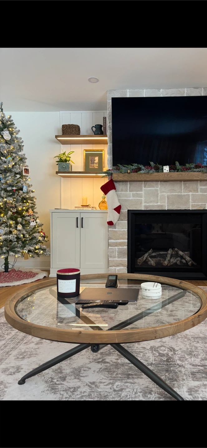 This round coffee table features a glass top with a wood and metal base. In good condition, minor scratches on the glass