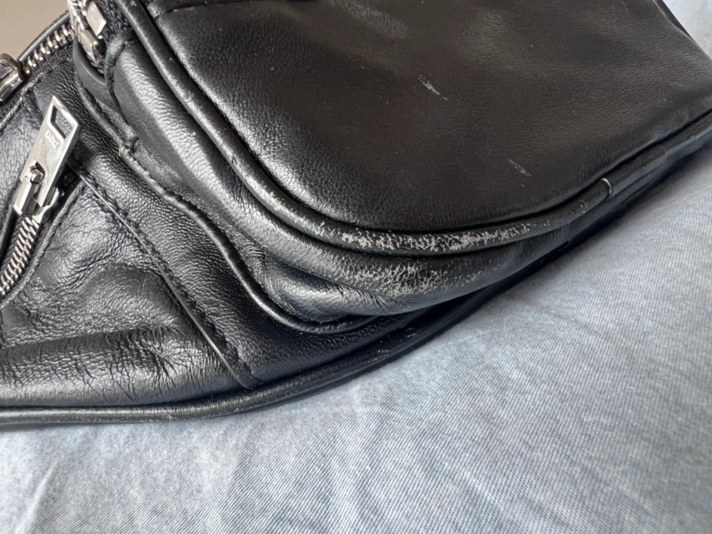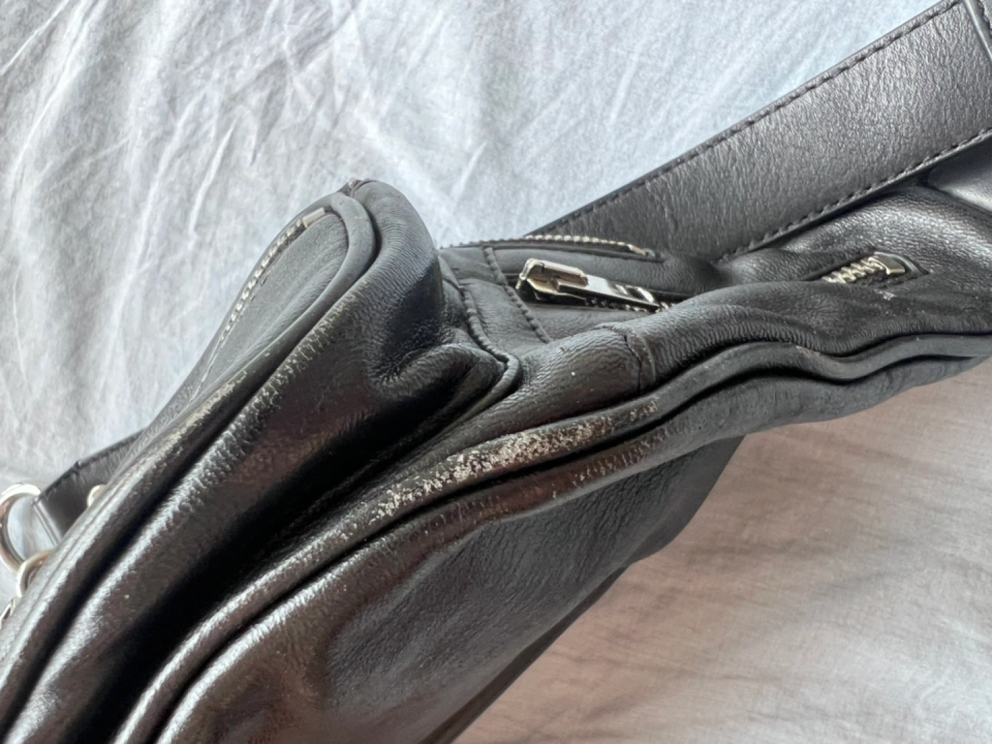 I’m letting it go because I simply have too many things and need to downsize. There’s some wear on the leather, which you can see in the photos. If you want to touch it up, you can easily get leather care products at a shop—usually just $10 to $20. Honestly, I don’t think the wear is that noticeable when you’re using it, since it’s in motion. I’ve done my best to photograph all the flaws when the bag is laid flat so you can see everything clearly.