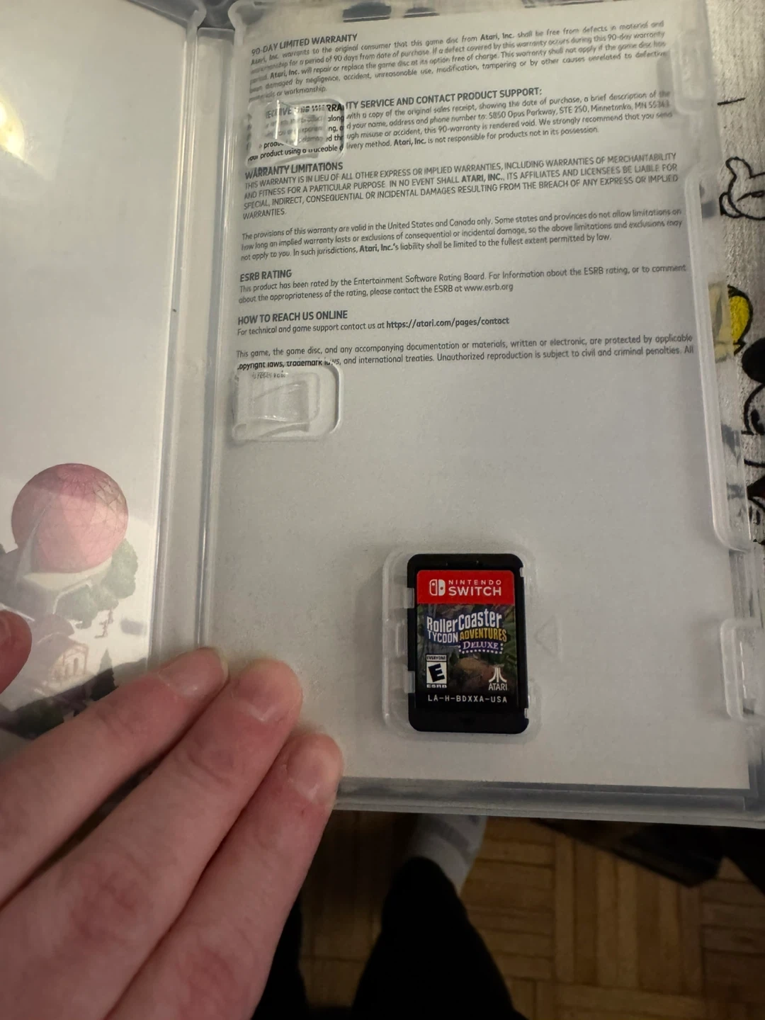 This game is RollerCoaster Tycoon Adventures Deluxe for the Nintendo Switch. It includes the game cartridge. The game is rated E for Everyone.