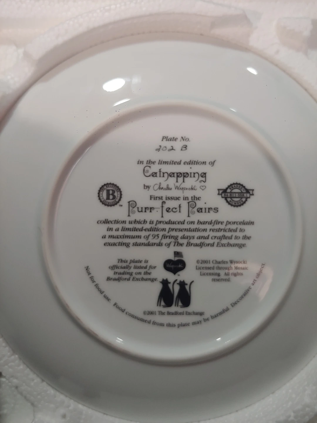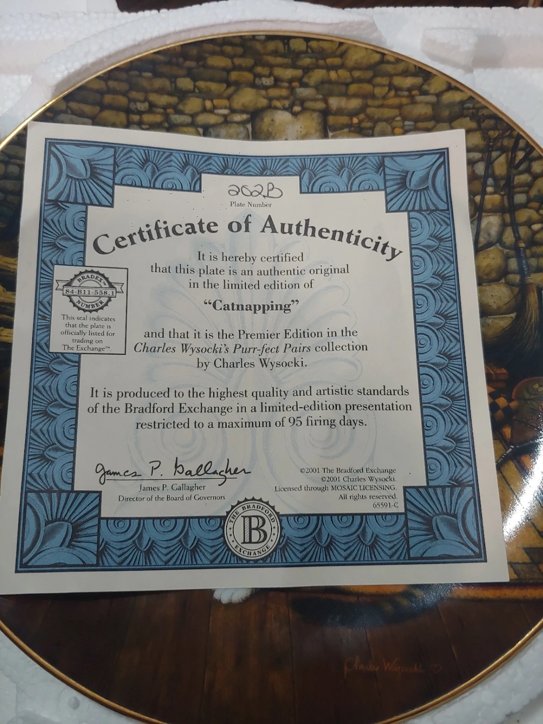 Selling a Bradford Exchange collector plate titled 'Catnapping' by Charles Wysocki. This is the first issue in the Purr-fect Pairs collection. It is produced on bardfire porcelain in a limited-edition presentation restricted to a maximum of 95 firing days. Includes certificate of authenticity
