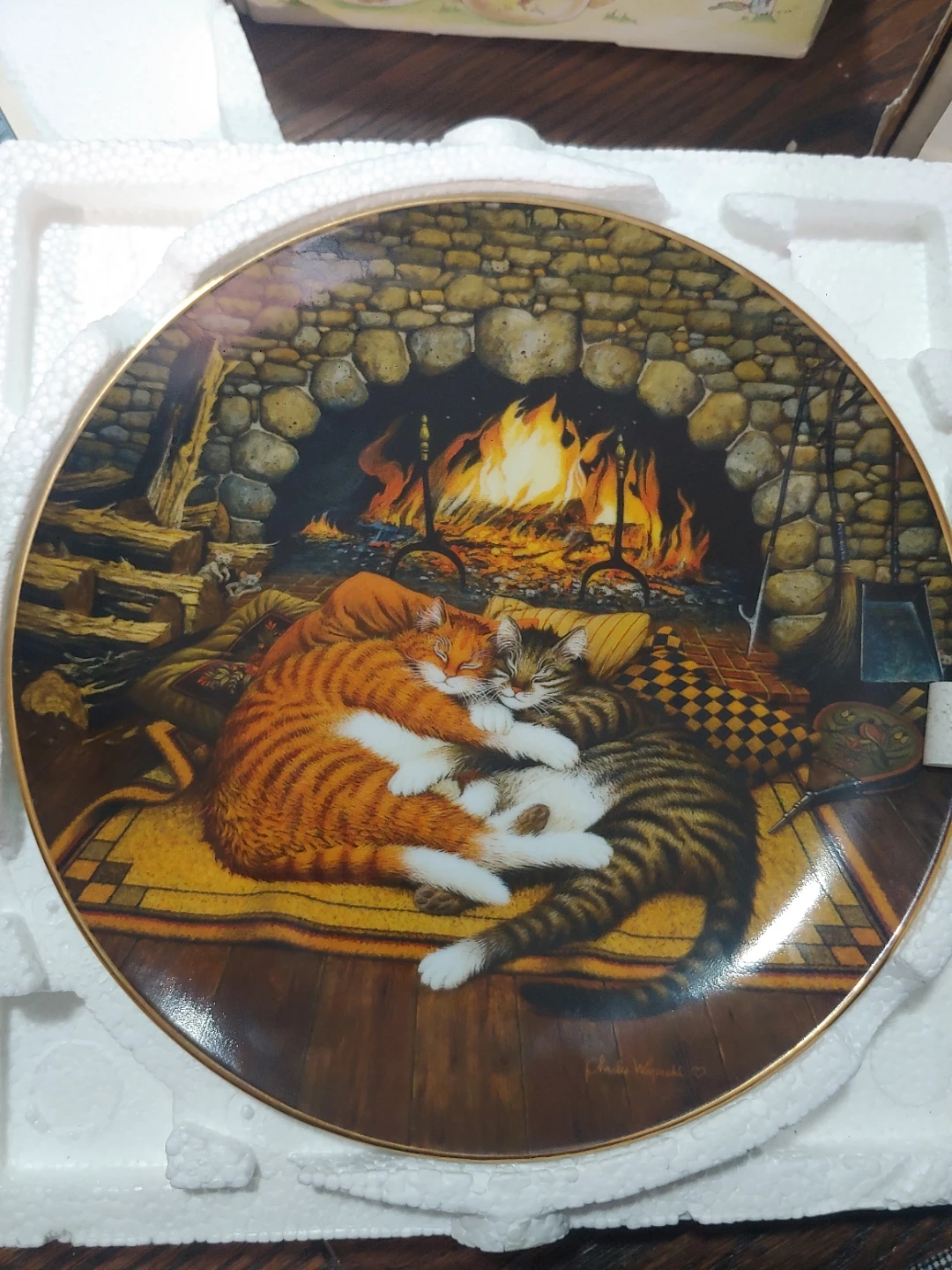 Selling a Bradford Exchange collector plate titled 'Catnapping' by Charles Wysocki. This is the first issue in the Purr-fect Pairs collection. It is produced on bardfire porcelain in a limited-edition presentation restricted to a maximum of 95 firing days. Includes certificate of authenticity