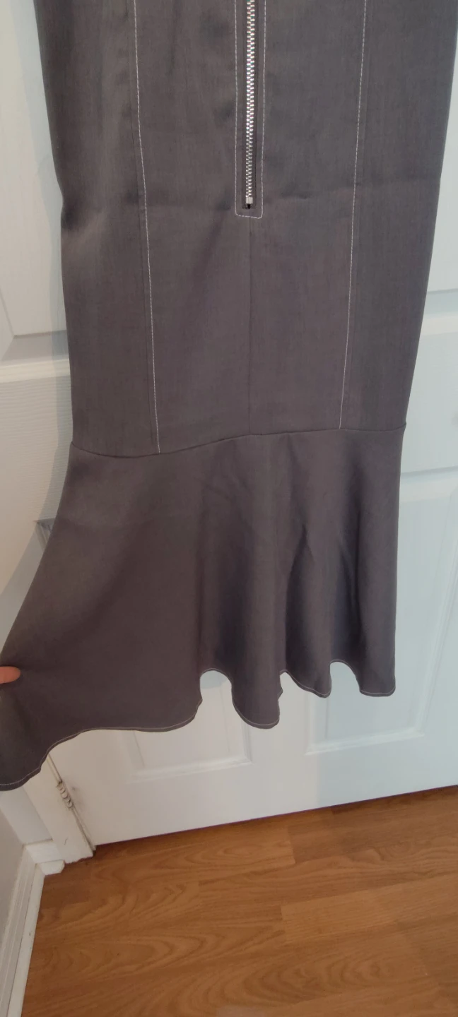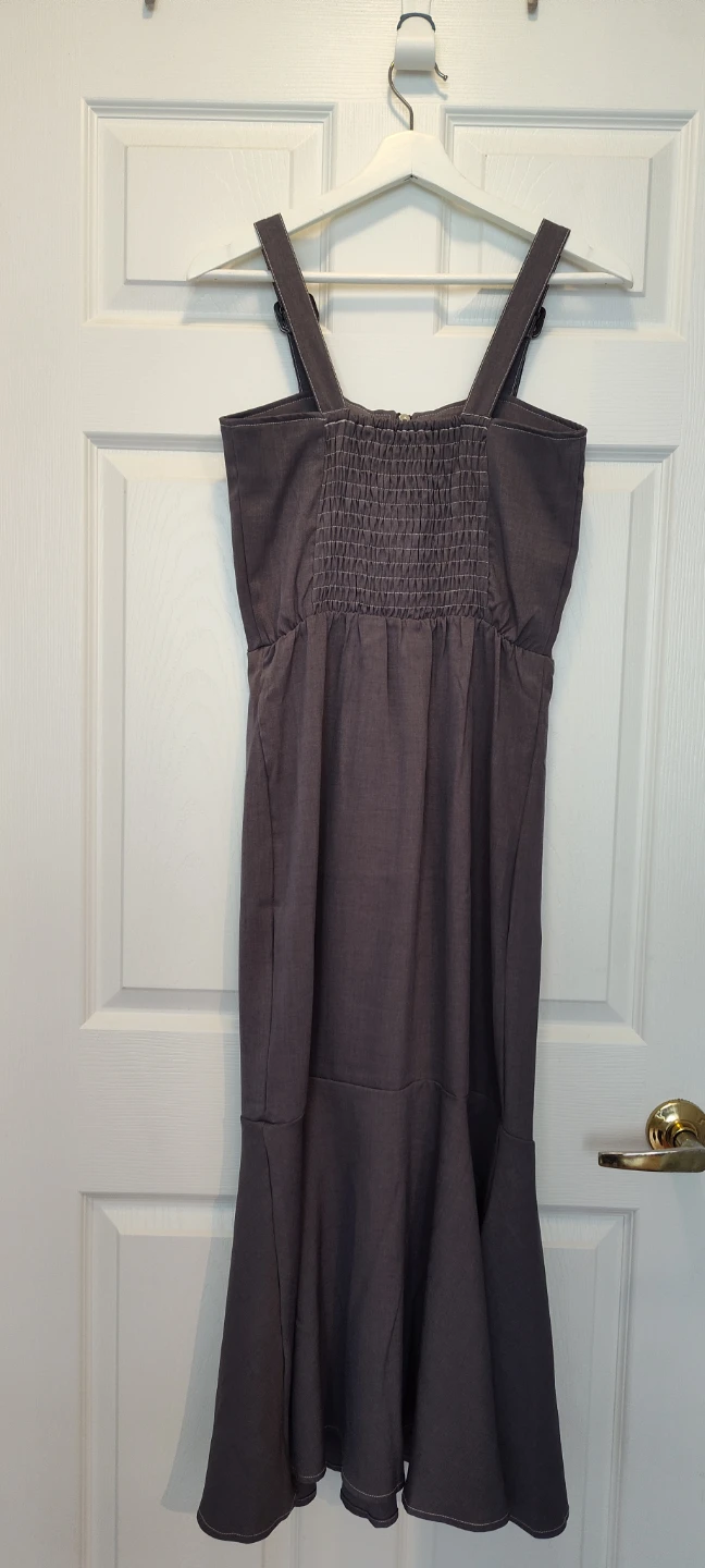 This grey dress has a ruched bodice with adjustable buckle straps. It features a fitted waist that flares out into a mermaid hem. A zipper closure provides easy wear.