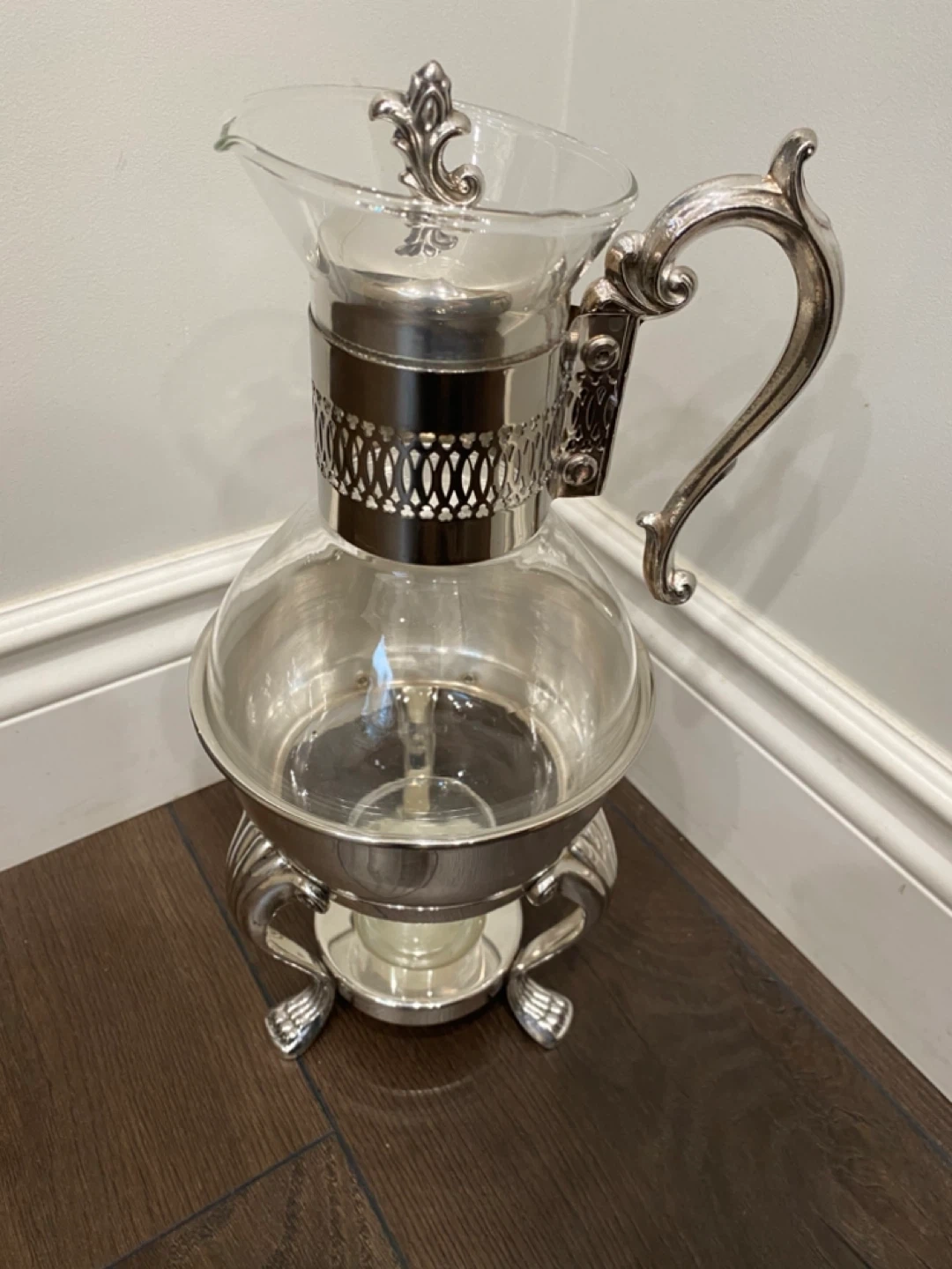 Selling a lovely vintage glass carafe with a silver-plated stand and handle. It's in great condition and would be a beautiful addition to any table setting! The silver detailing is quite ornate and eye-catching