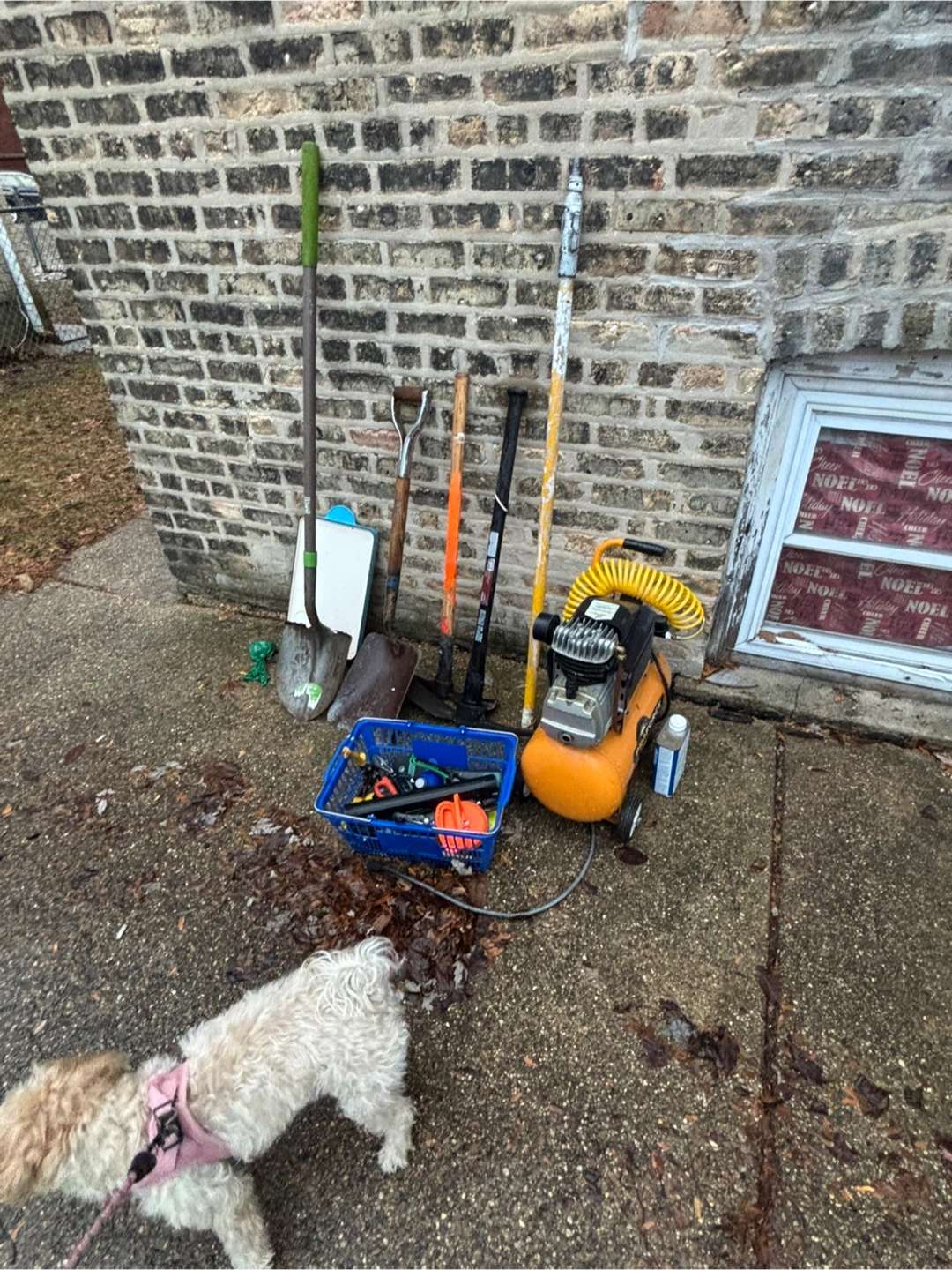 various tools and equipment. Includes shovels, rakes, an air compressor, and a blue basket filled with smaller tools. Everything is in used condition and ready for a new project!