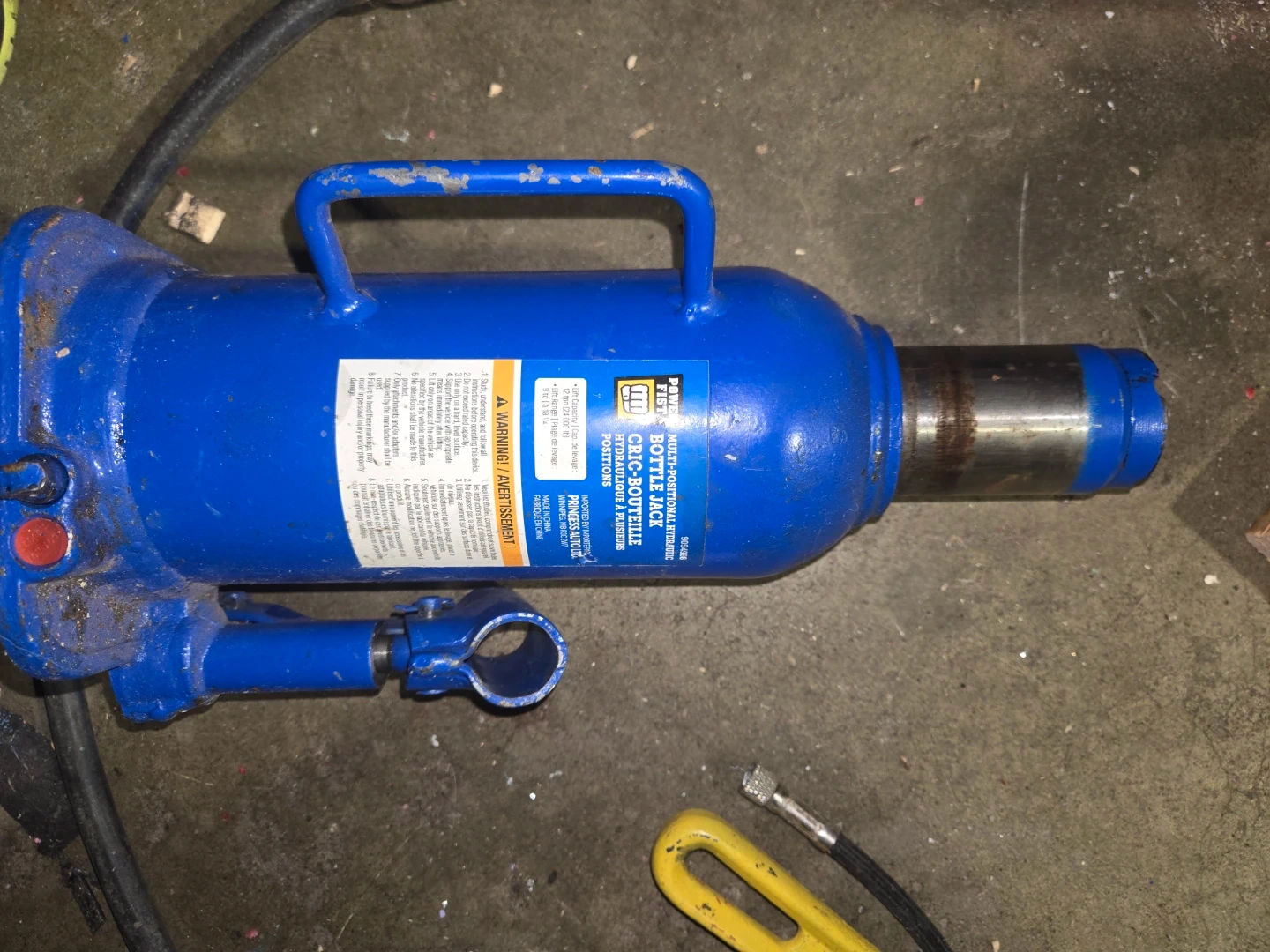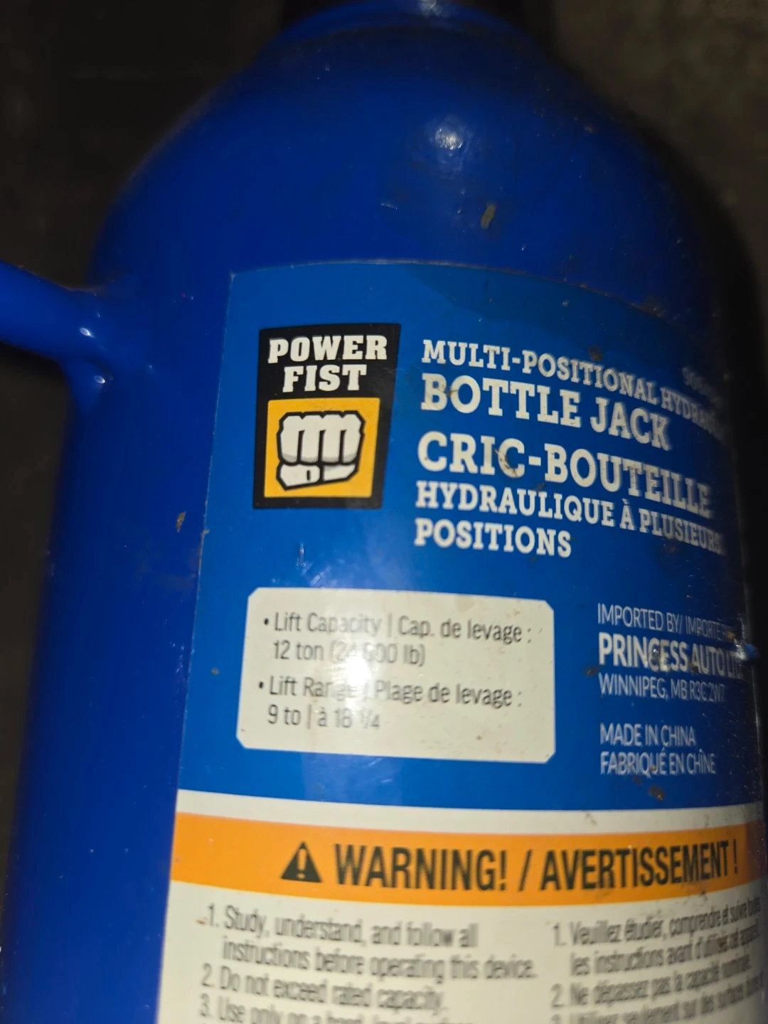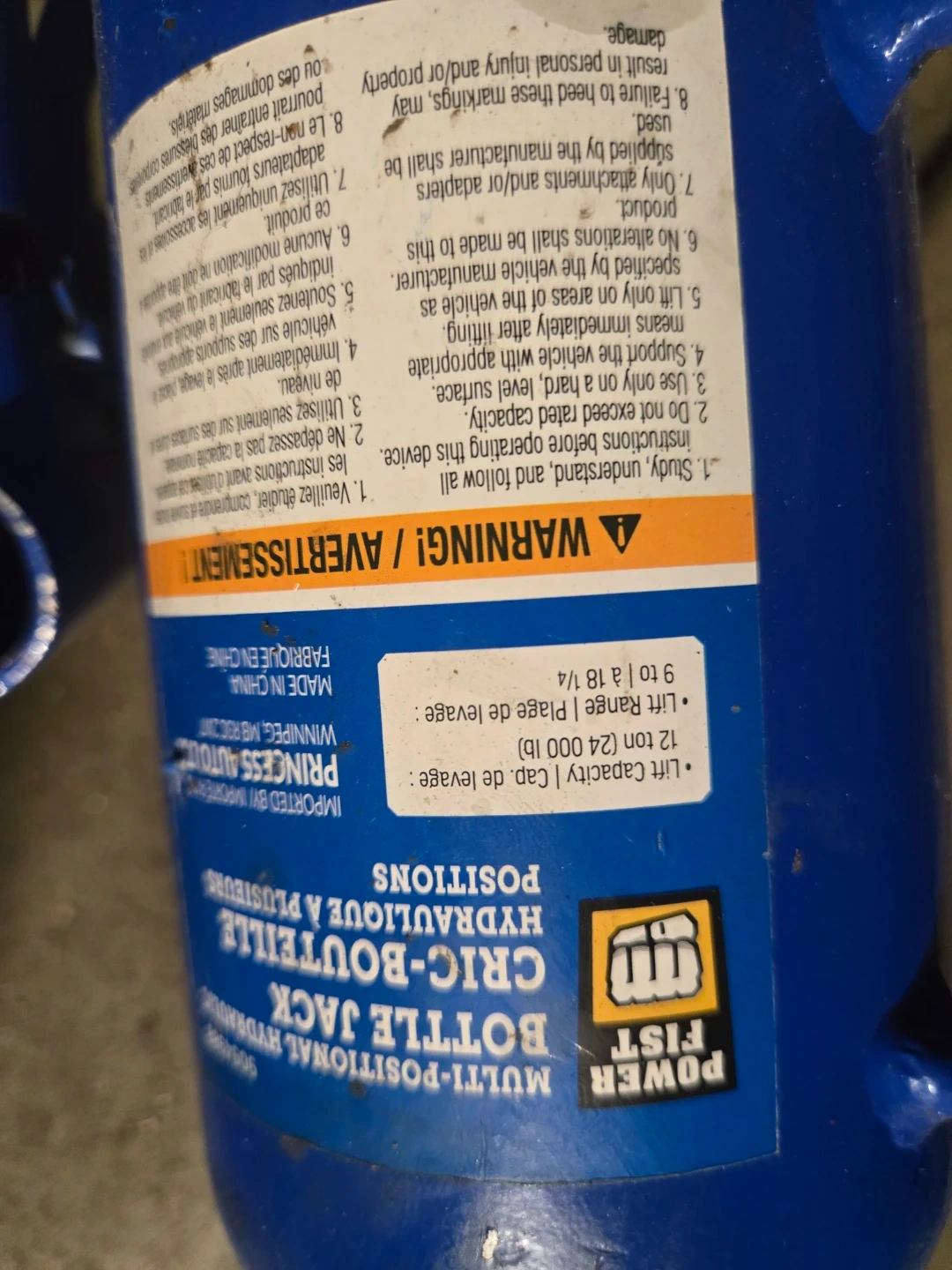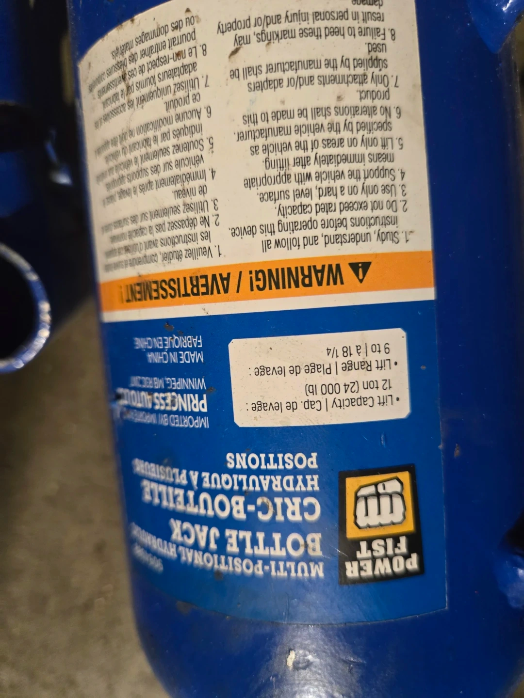 This is a 12-ton bottle jack with a lift range of 9 to 18 1/4 inches. It's a multi-positional hydraulic jack. This type of jack is useful for lifting vehicles for maintenance or repairs.