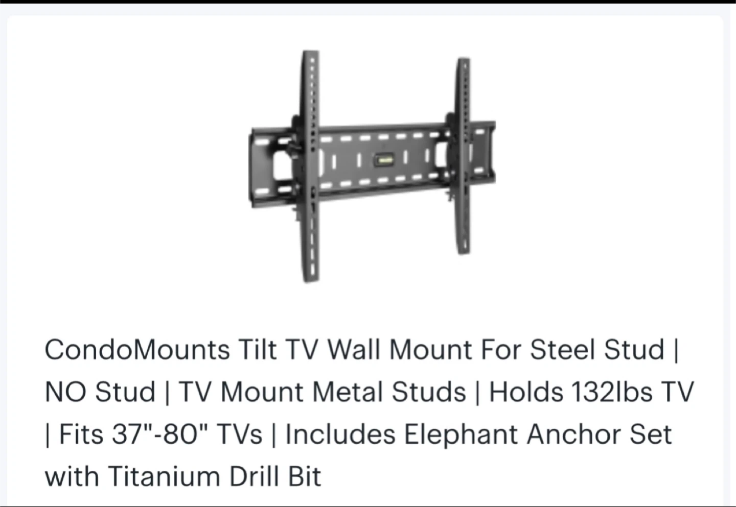 This is a CondoMounts tilt TV wall mount. It fits 37"-80" TVs and holds up to 132lbs. Includes an Elephant Anchor Set with a titanium drill bit.
