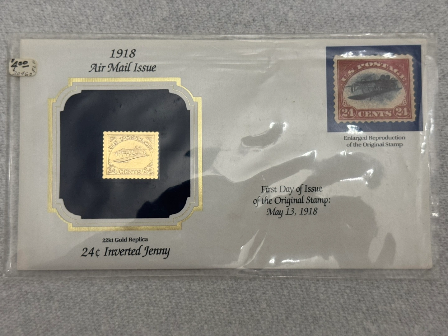 Selling a 22kt gold replica of the 1918 Air Mail Issue 24¢ Inverted Jenny stamp. This piece commemorates the First Day of Issue of the Original Stamp: May 13, 1918. A great piece for collectors!
