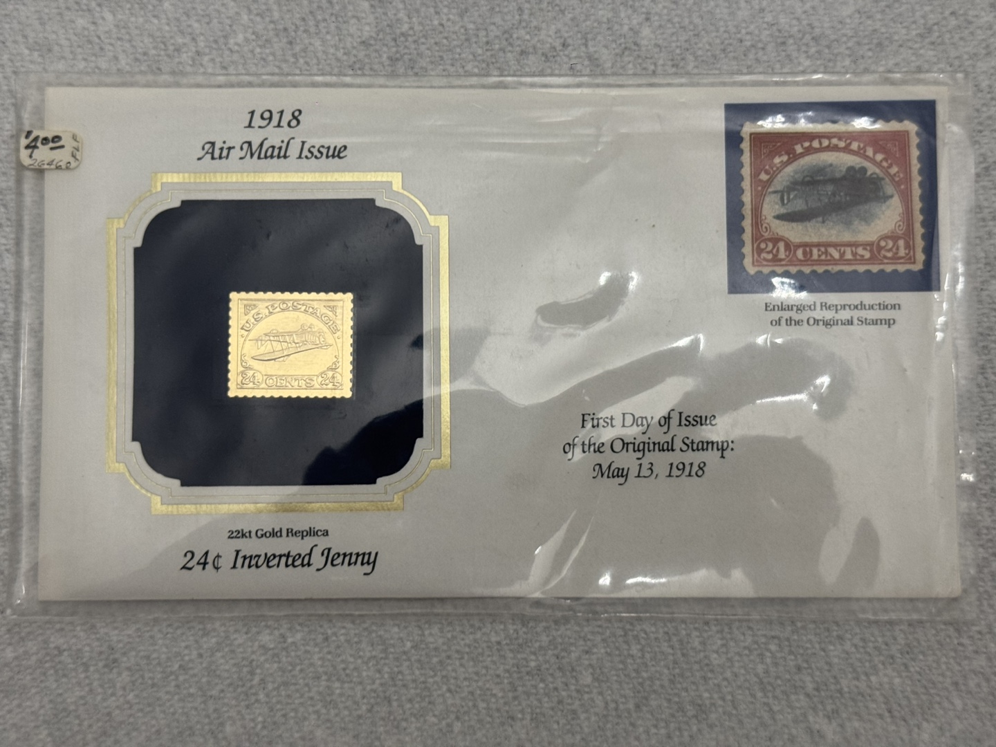 Selling a 22kt gold replica of the 1918 Air Mail Issue 24¢ Inverted Jenny stamp. This piece commemorates the First Day of Issue of the Original Stamp: May 13, 1918. A great piece for collectors!