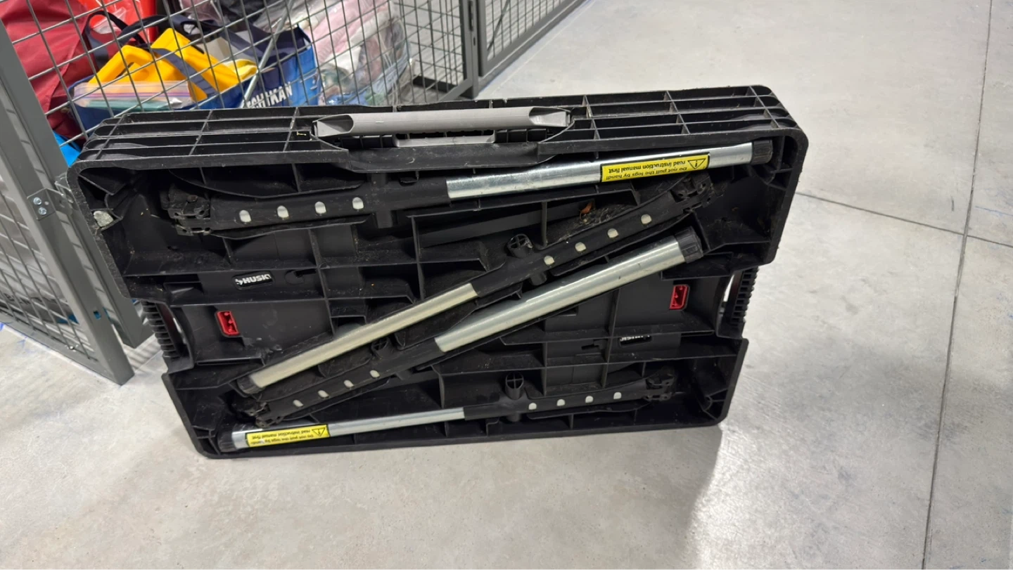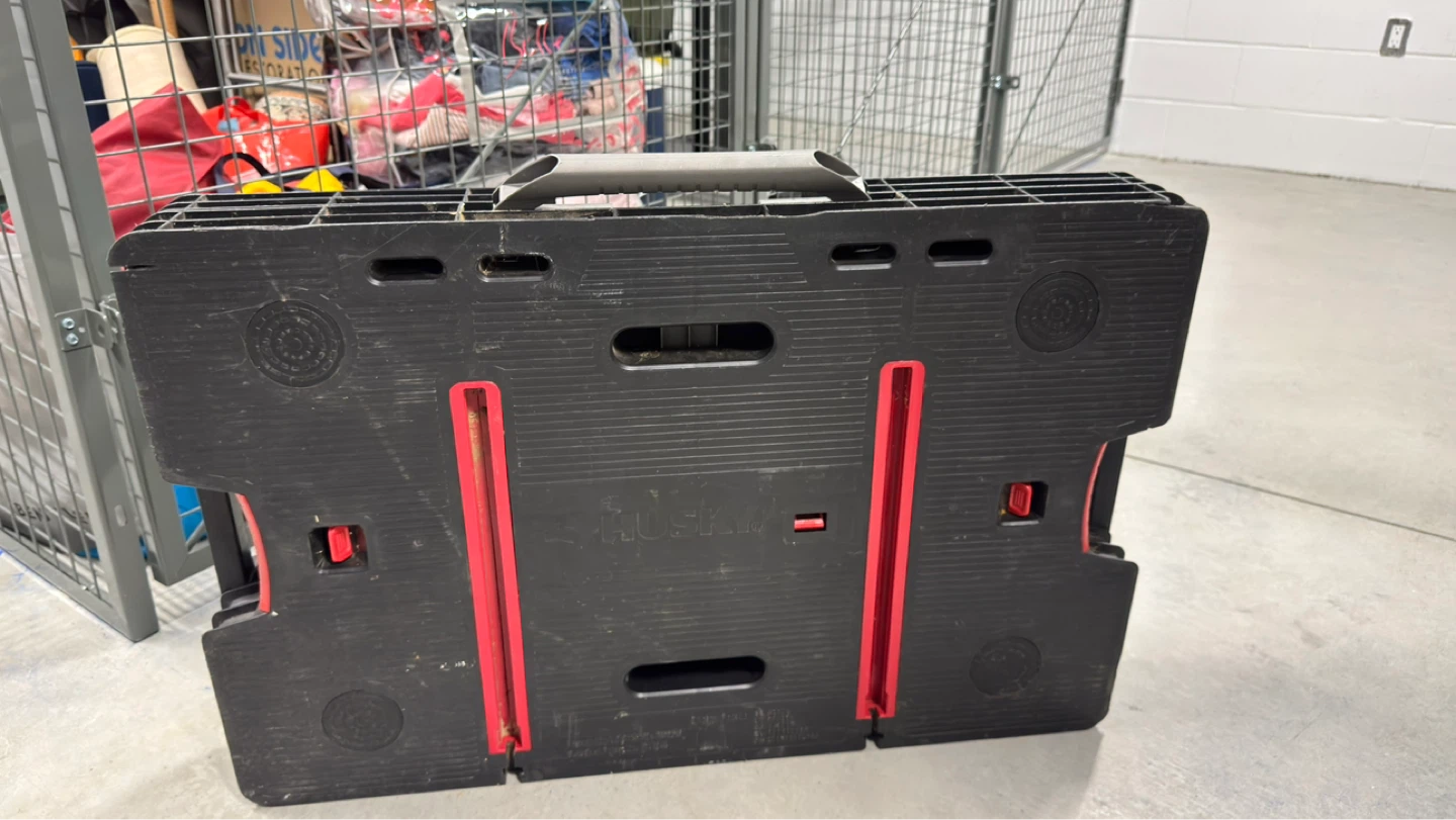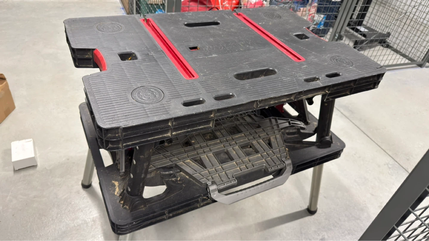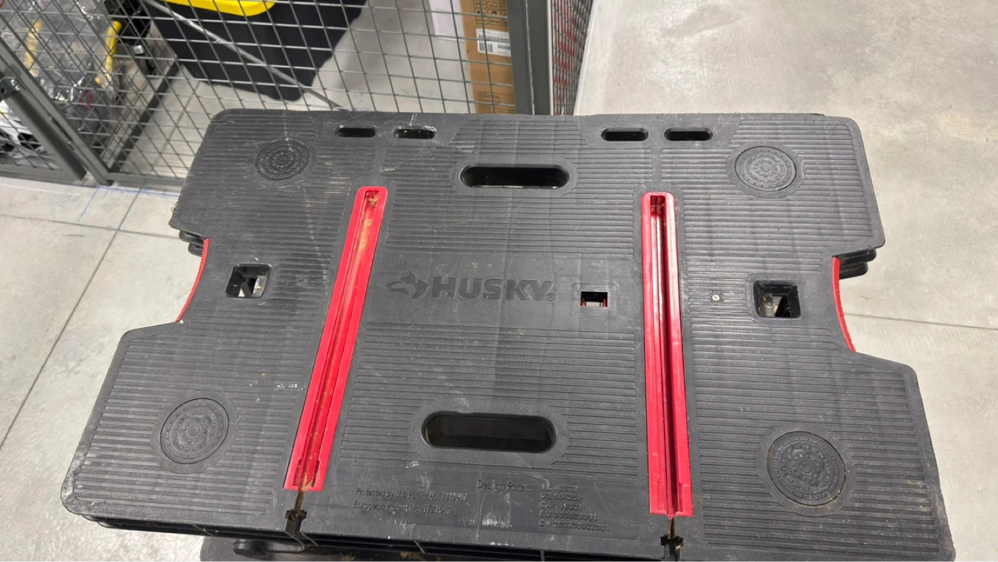 This Husky folding sawhorse work table is made of durable black and red plastic with metal legs. It's easy to set up and take down for various projects. It's great for use in a workshop or on a job site.