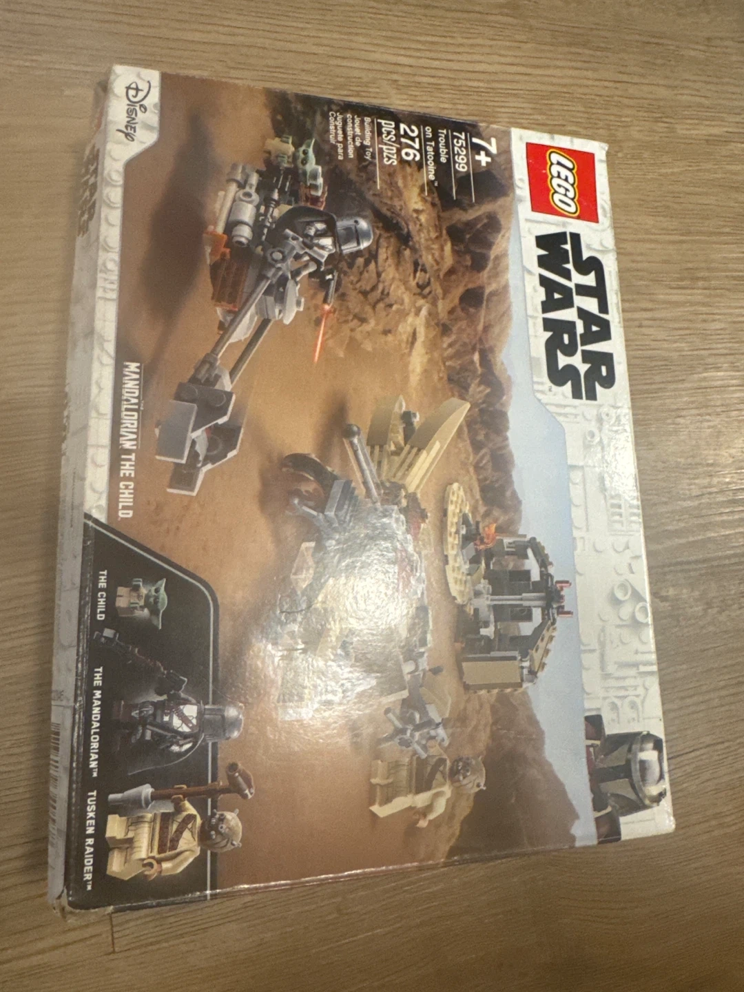 Build the LEGO Star Wars Trouble on Tatooine set, number 75299. It includes 276 pieces and is recommended for ages 7+. This set features characters from The Mandalorian, including the Child and a Tusken Raider. It's perfect for young Star Wars fans!