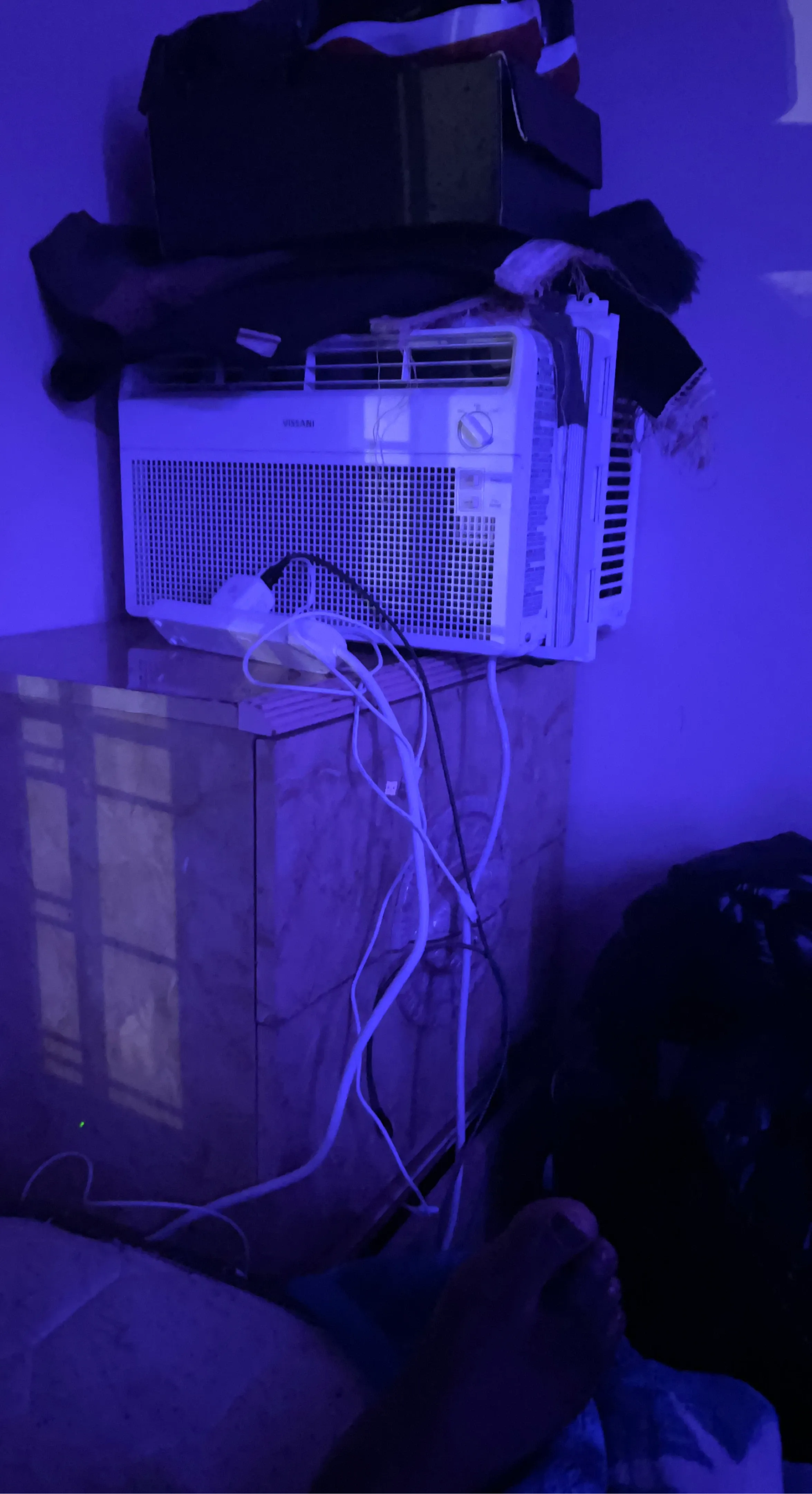 Vissani window air conditioner. White unit with controls on the front. It's a great way to cool down a room. Includes power cord.
