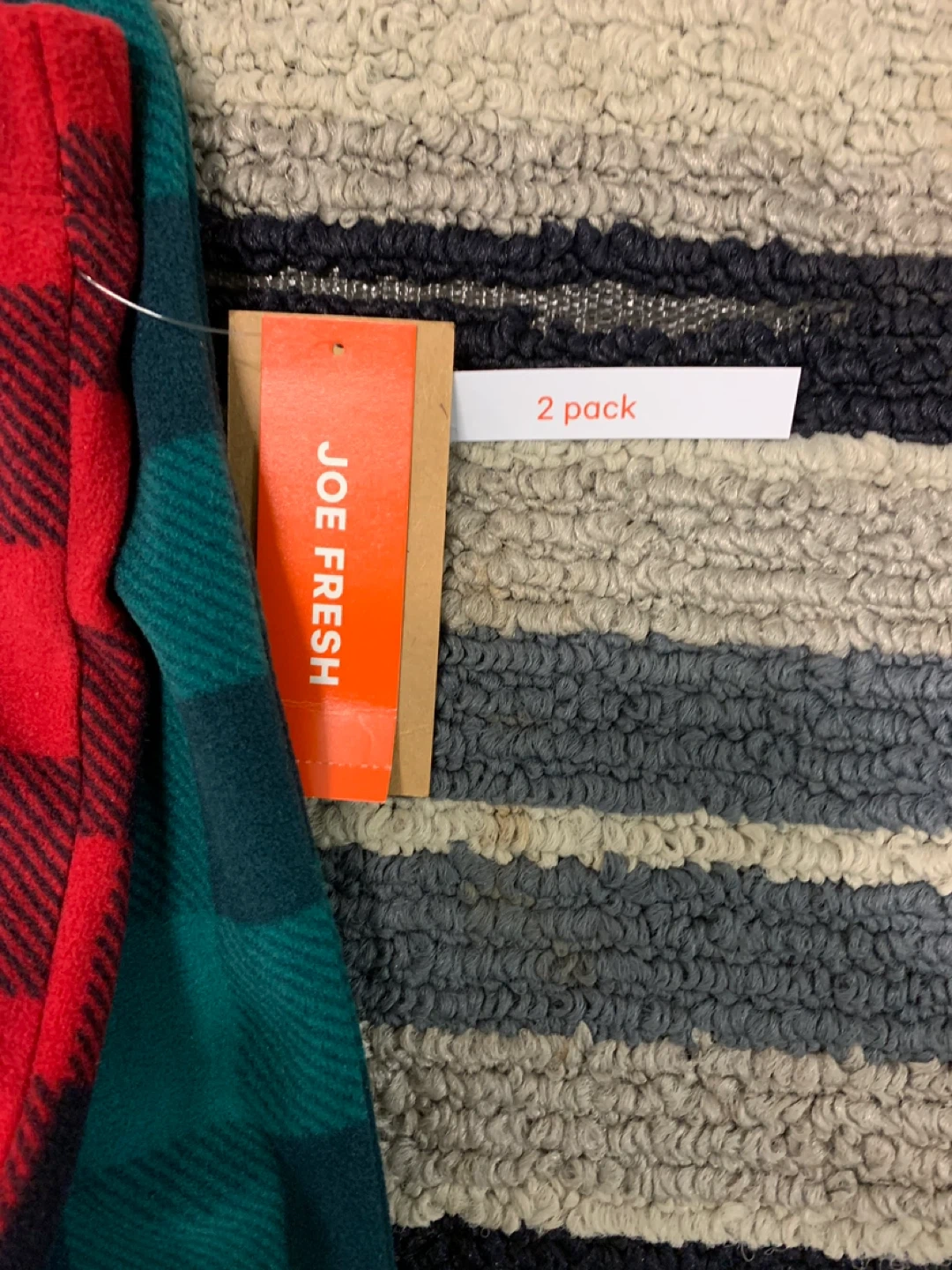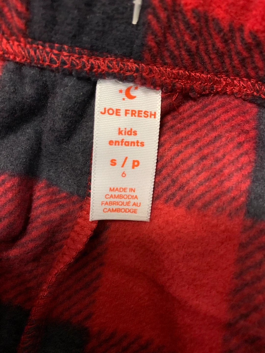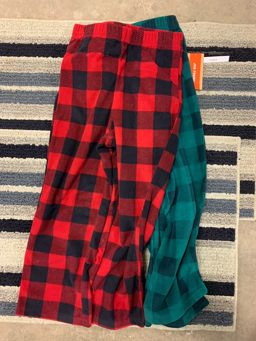Two pairs of cozy Joe Fresh pajama pants for kids. Both are a soft, flannel material in a classic plaid pattern. One pair is red and black, the other is green and black. They're a size small/petite. Perfect for lounging around the house!