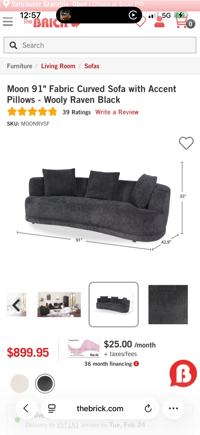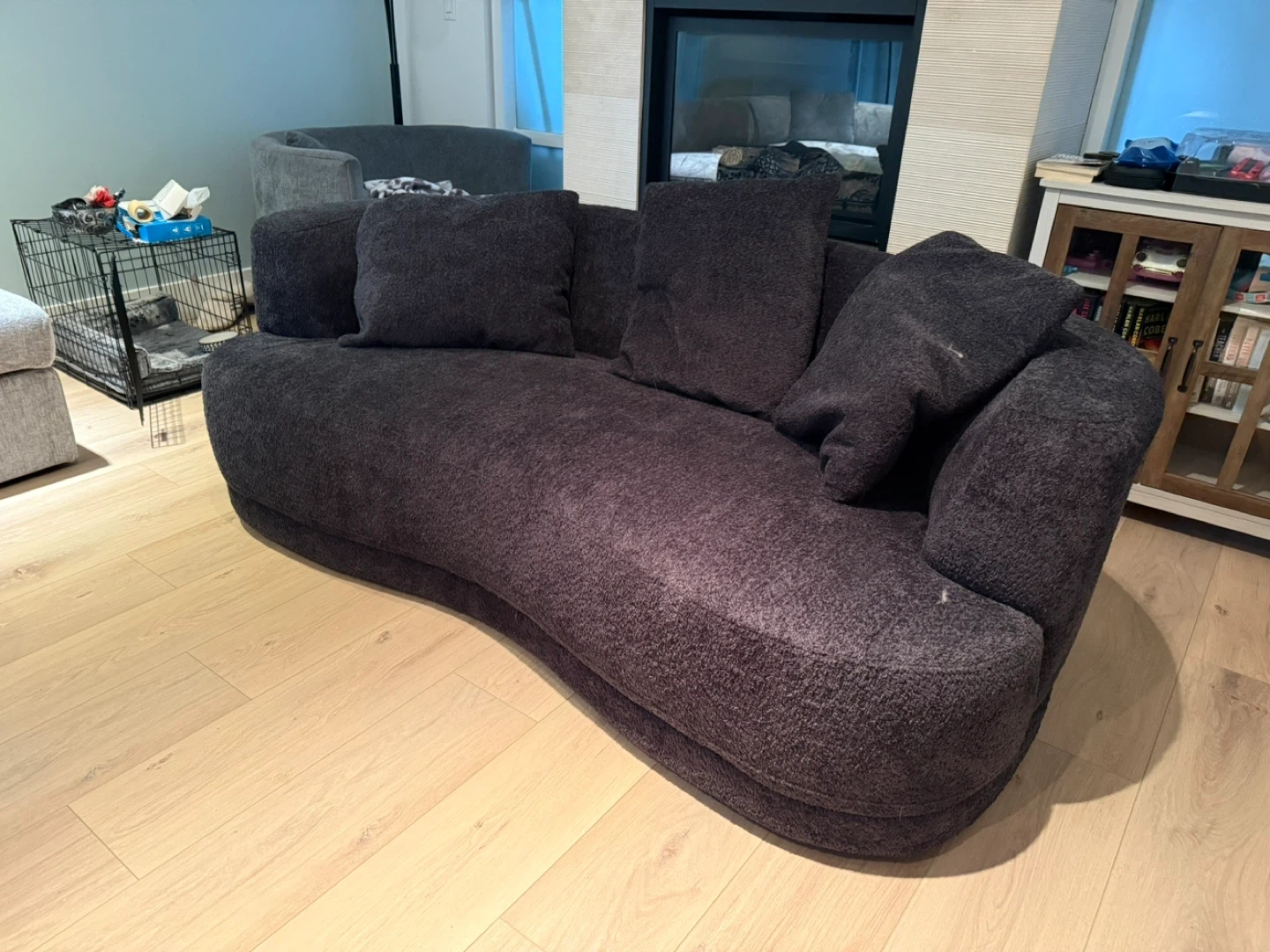 This is the Moon 91" fabric curved sofa in Wooly Raven Black. It comes with accent pillows for added comfort. The sofa measures 91 inches in length.