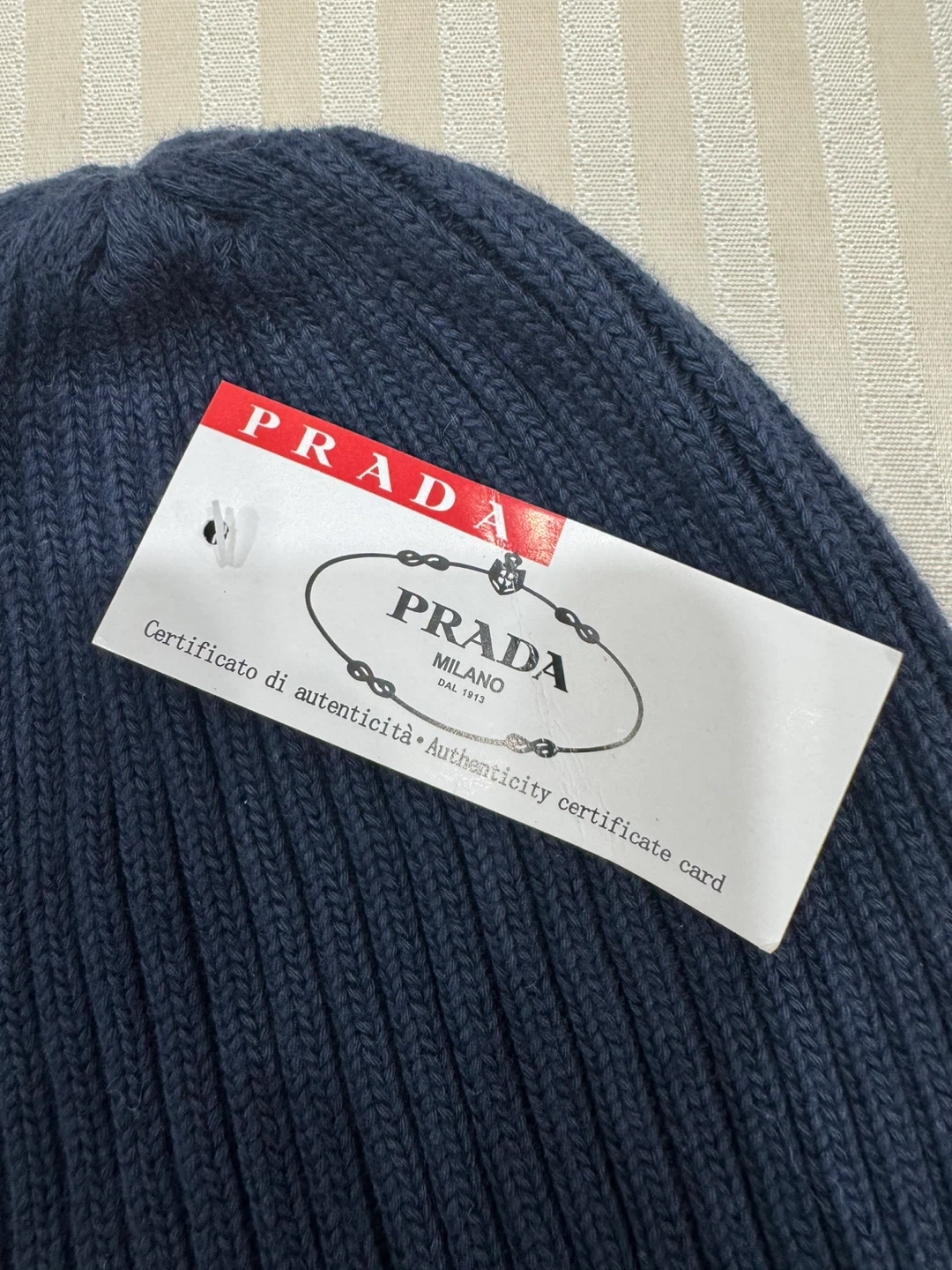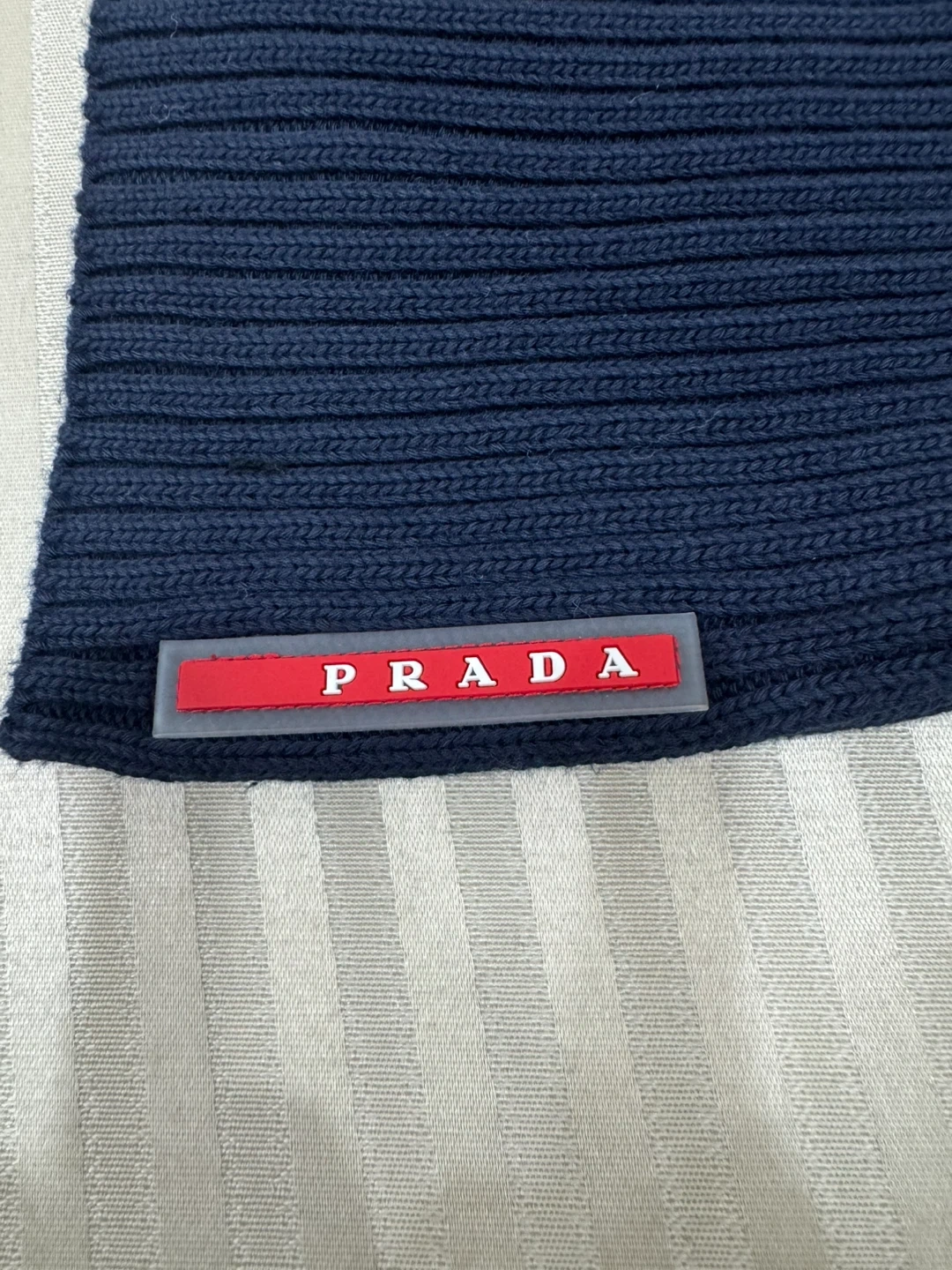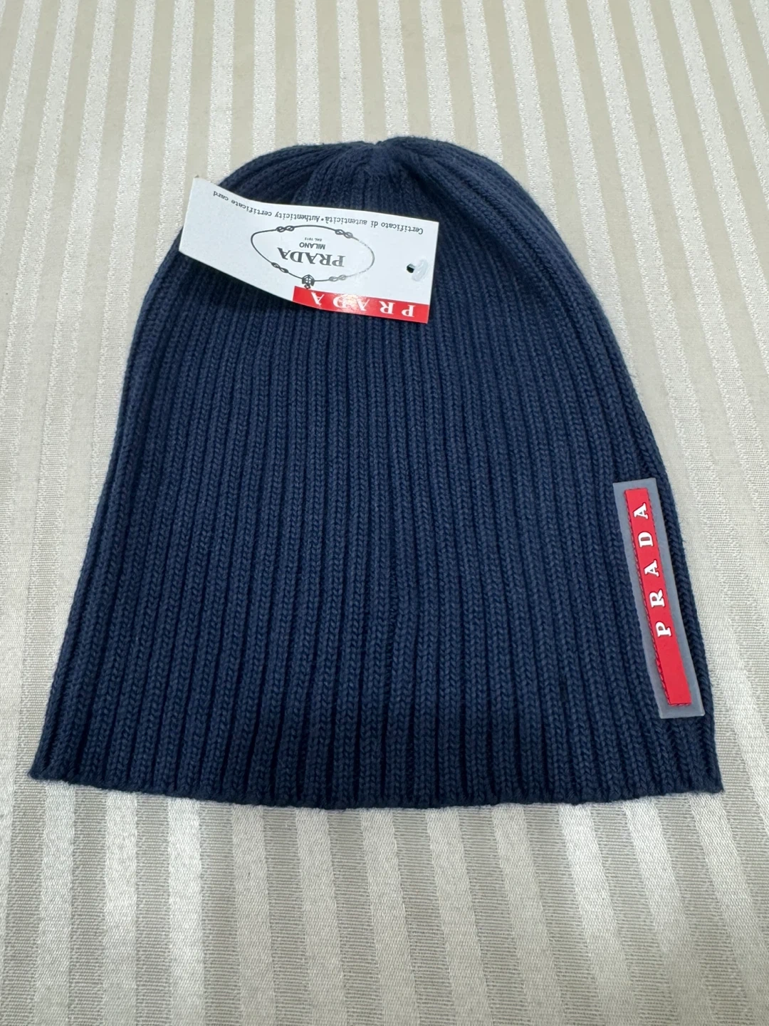 This is a Prada navy blue ribbed knit beanie. It's made from a comfortable material with the iconic Prada logo detail. It's a stylish accessory for cooler weather.