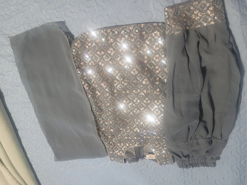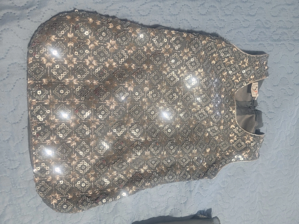 Selling a girls' sequin top with matching sleeves and a sheer overlay. It's in great condition and ready for a new home! The set features a sparkly sequin design and a comfortable fit.