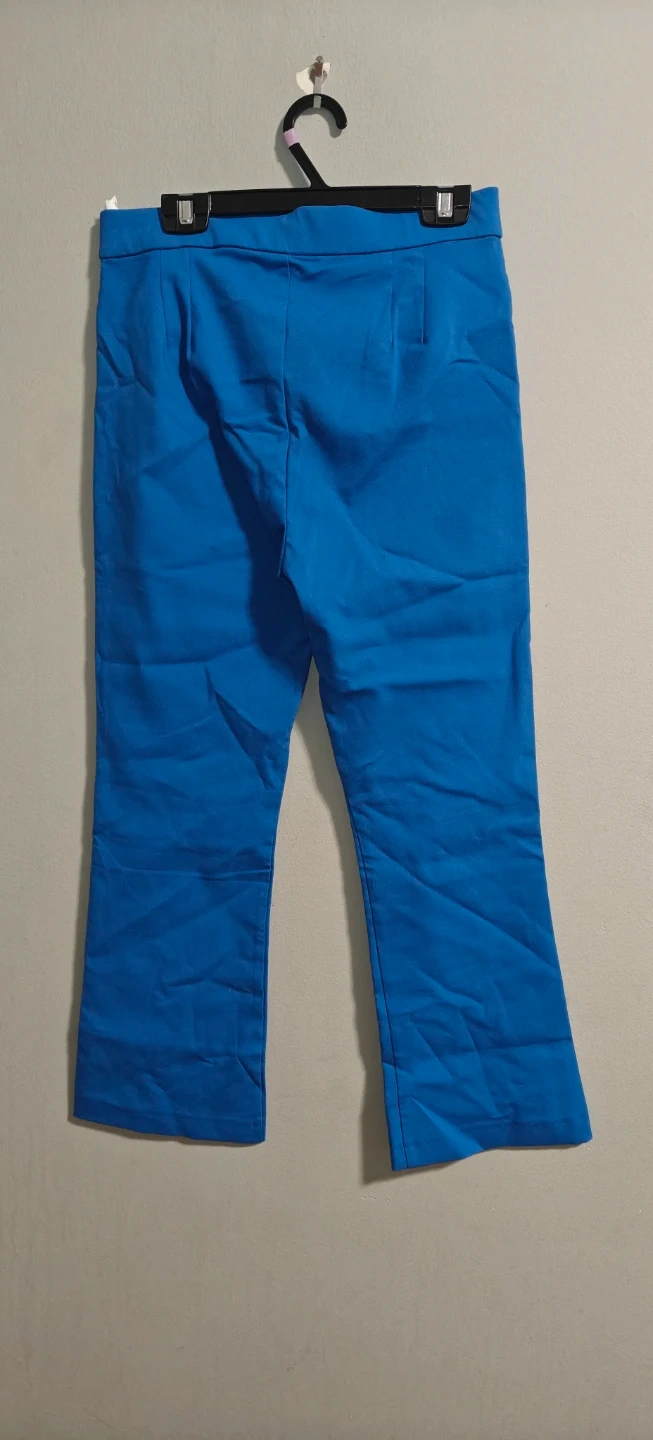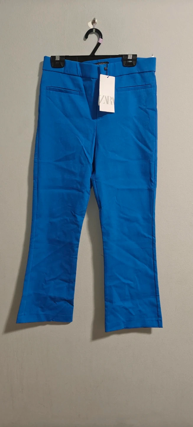 These are Zara cropped flare trousers in a vibrant blue colour. They're made from a smooth fabric and feature a modern silhouette.