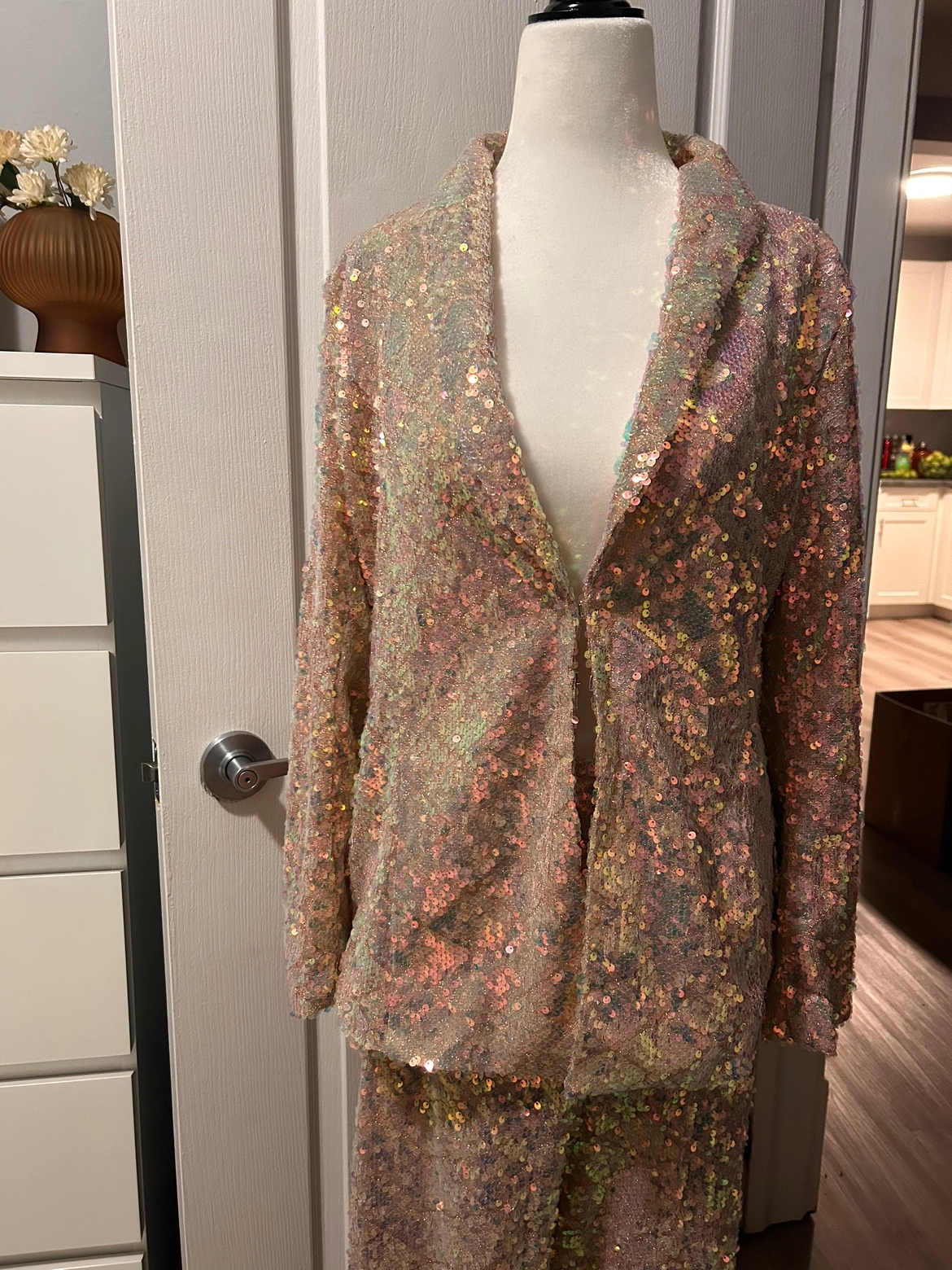 Selling pink sequin blazer and pant set. Only worn once for an event. Blazer is medium and pants are large but were altered to fit as a medium.