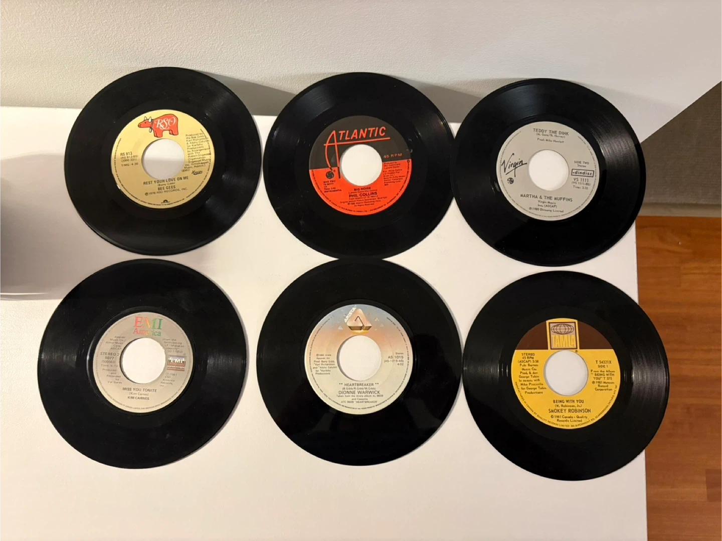 Collection of 6 vintage 45 RPM vinyl records featuring classic pop and rock artists. Great for collectors, jukebox owners, or anyone who loves retro vinyl.
