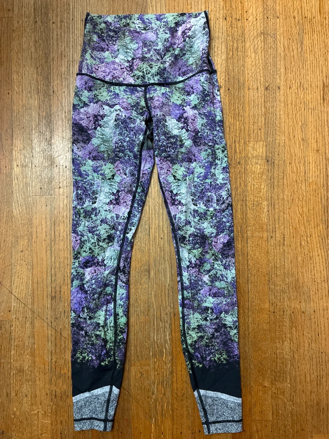 These Lululemon Align leggings are designed for comfort and movement. They feature a unique purple, green, and black abstract print. High-rise style with a cropped length. Perfect for yoga or everyday wear!