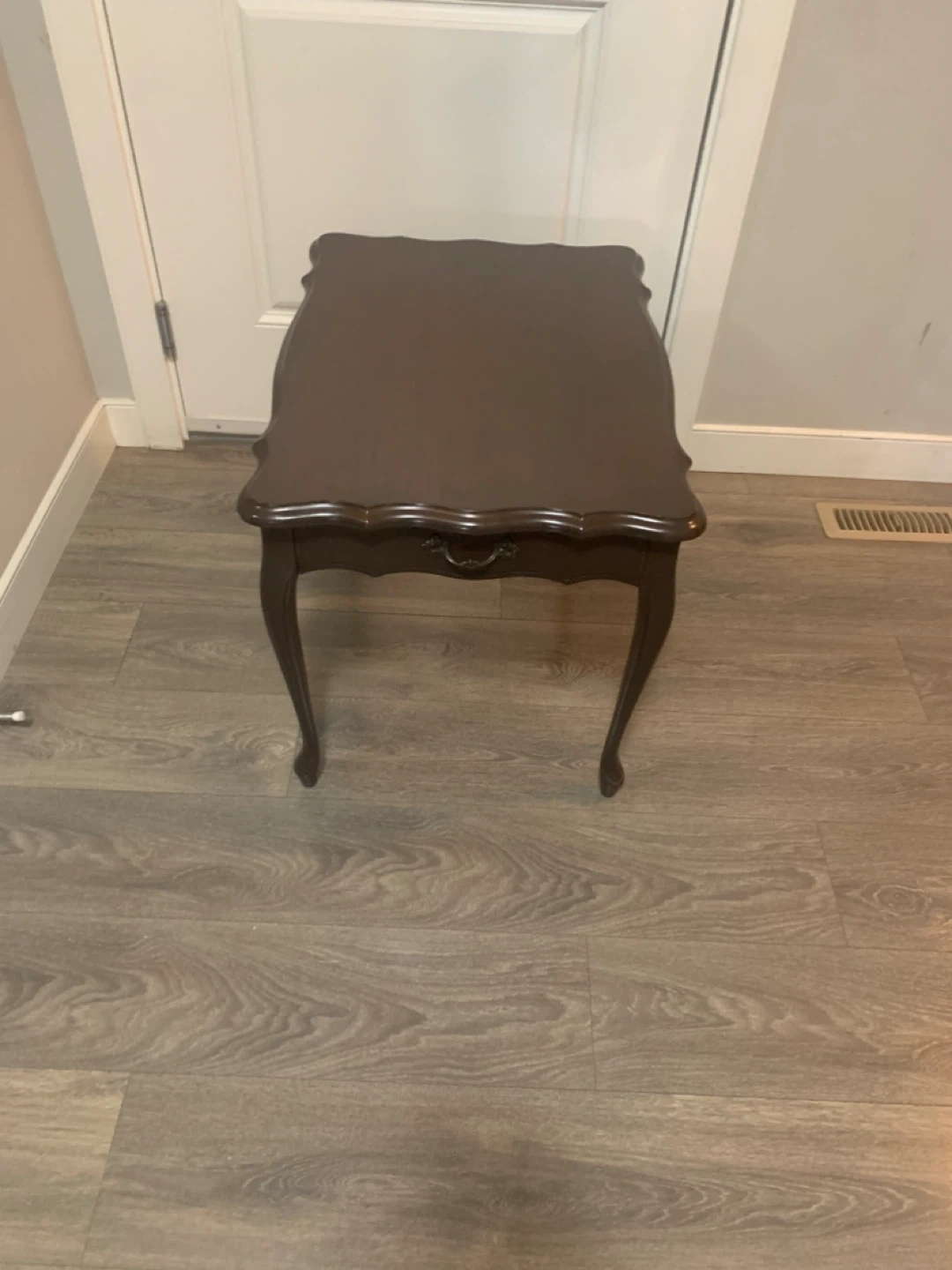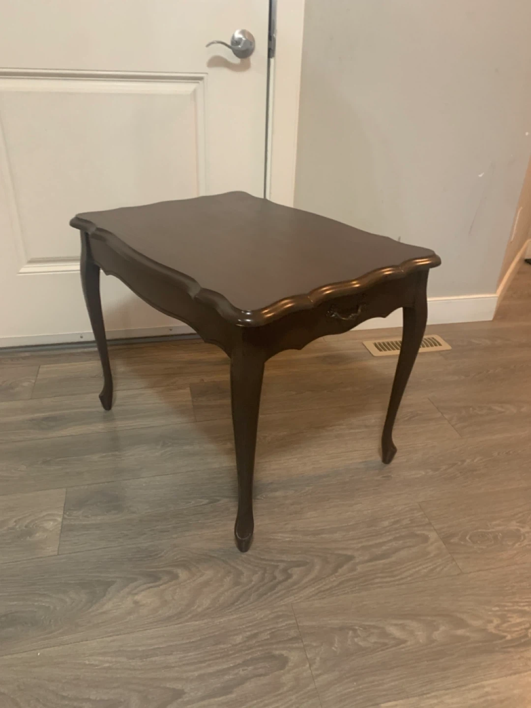 This vintage-style side table features a dark brown finish and elegant curved legs, making it a charming addition to any room. It is still sturdy and functional. It's perfect for holding lamps, books, or your favourite cup of tea. I think it's lovely, I hope you do too! If the ad's still up, it's still available!