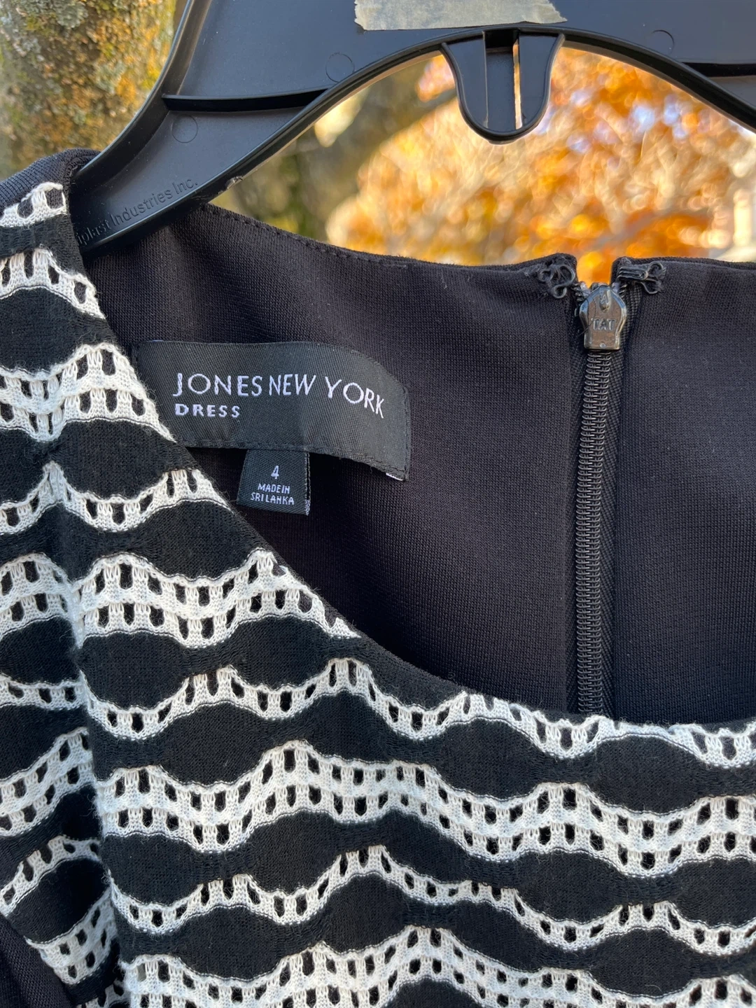 Selling a lovely Jones New York dress in size 4! It's a stylish black dress with a unique white pattern. Perfect for any occasion!