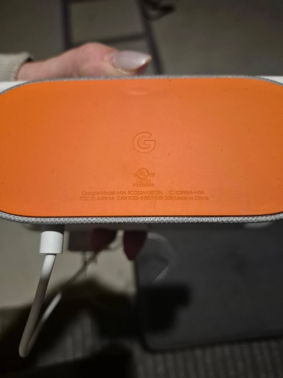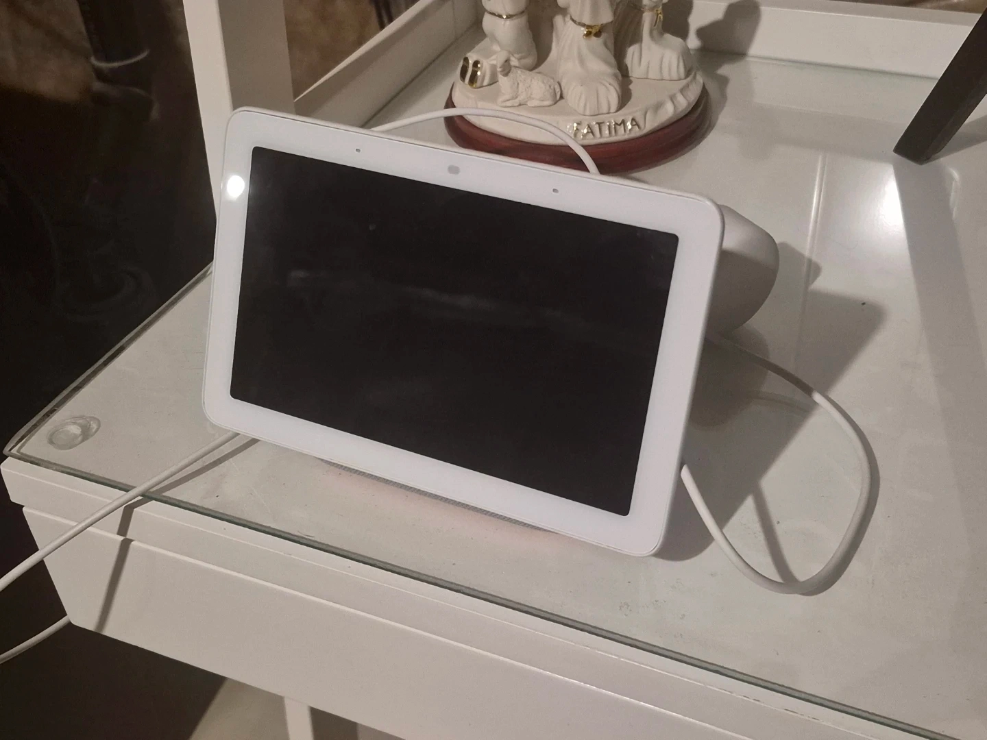 This is a white Google Nest Hub smart display. It's a helpful assistant for your home. Great for playing music or checking the weather! This hub is the 1st Gen.