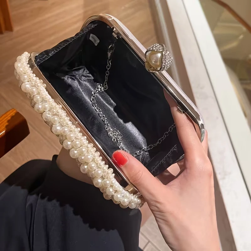 This is a beautiful pearl beaded clutch bag, perfect for a special occasion! It comes with a delicate chain strap. The interior is lined with a smooth, dark fabric. It's in great condition and ready to add a touch of elegance to your outfit
